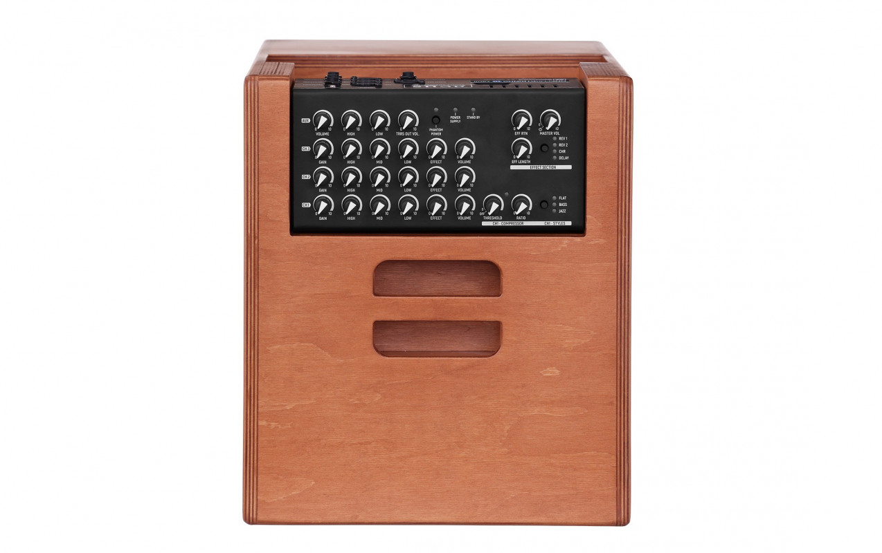 Each of the 3 inputs is equipped with Gain, a 3-band equalizer, effect send, and Volume. Input 1 also includes additional features: a dedicated compressor and a switch that alters the channel characteristics based on the selected type of instrument (Flat, Bass, Jazz).