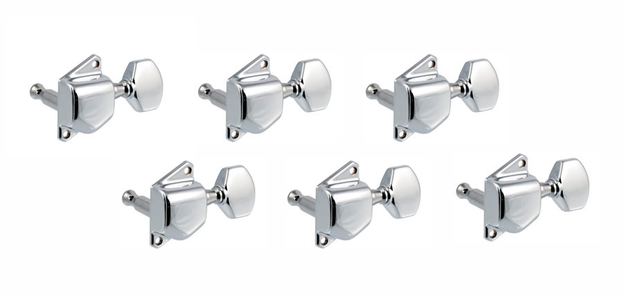 Set of 6 economical inline tuning pegs with diagonal mounting holes. 14:1 ratio. Hole spacing: 25.5 mm.