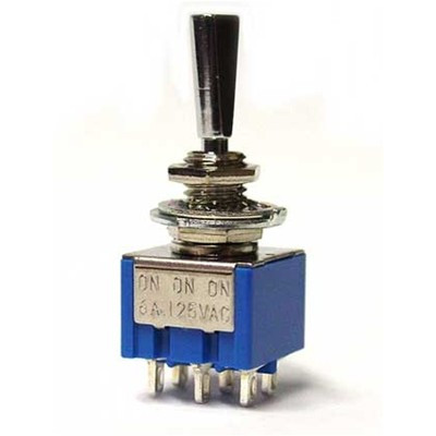 On-On-On Mini Switch, DPDT, with mounting hardware, chrome finish.