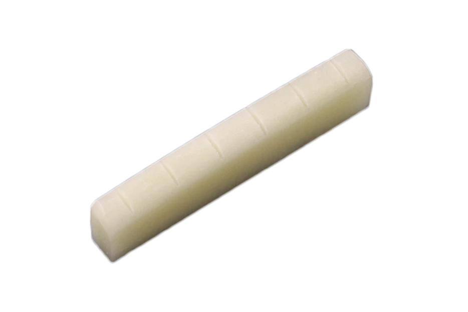 Unbleached bone nut, pre-slotted, for Gibson® electric guitars. Frequently used on the Les Paul® model. Dimensions: 1-3/4" x 3/16" x 3/8". Slot width: 1-3/8".
