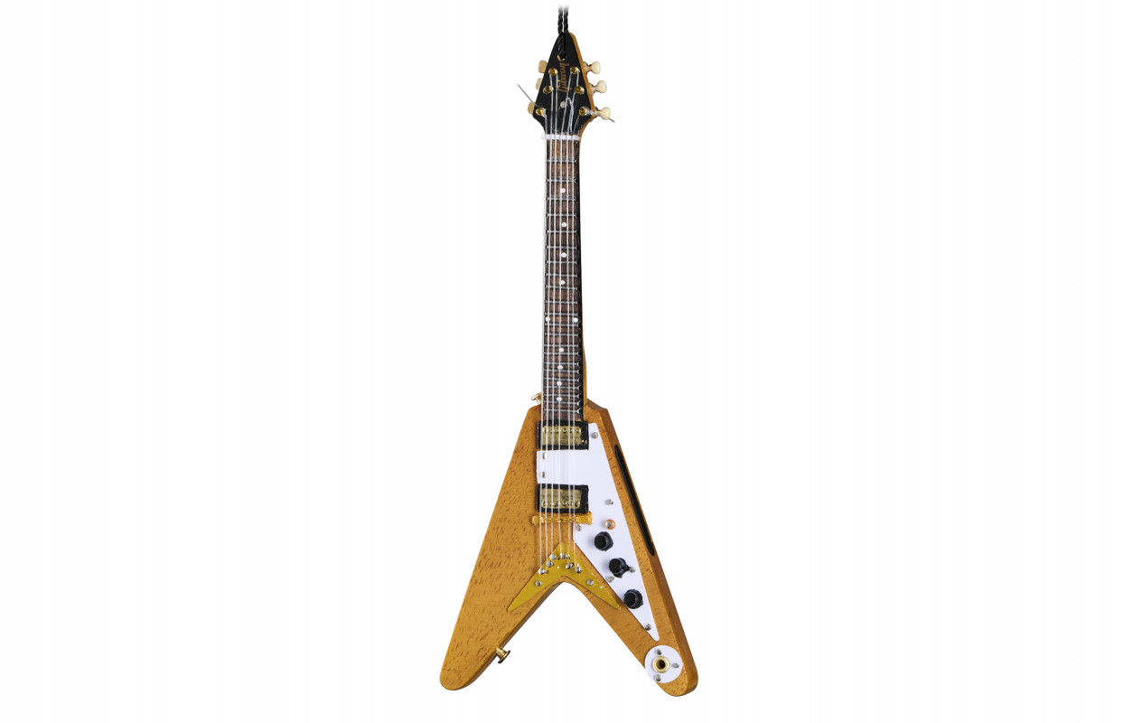 Handcrafted with great attention to detail, this 6-inch (approximately 15 cm) ornament faithfully reproduces the iconic shape of the Gibson Flying V, a legendary symbol in the history of rock and metal.