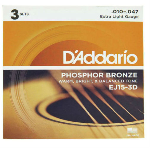 This set contains 3 D'Addario EJ15 strings, a convenient compromise for guitarists who desire the depth and projection of a light set's lower strings but a bit less tension on the higher strings for easier bending.