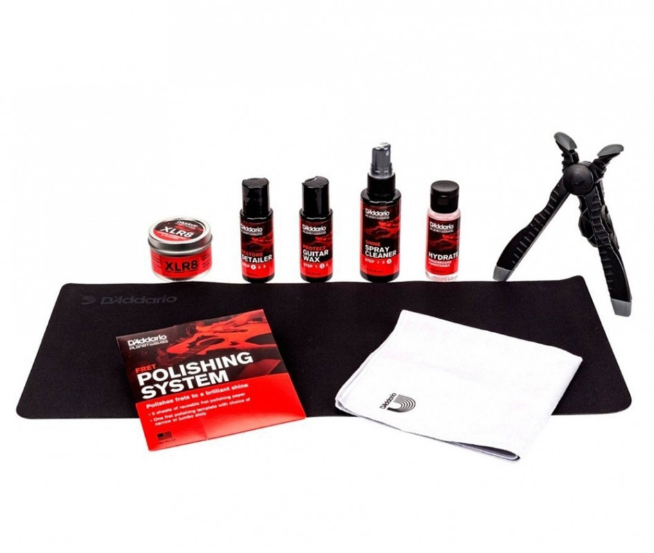Specifically, the kit includes: 3-Step Polishing System, Hydrate Fretboard Cleaner, Headstand, Microfiber Polishing Cloth, Fret Polishing System, and XLR8.