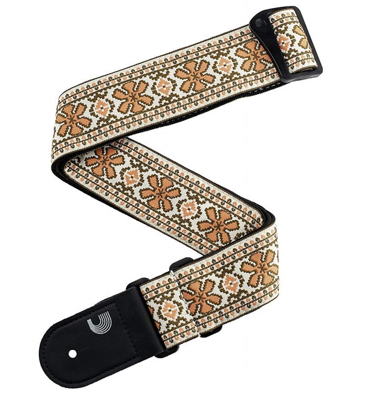 Guitar strap made of 5 cm woven nylon featuring a unique floral pattern inspired by the Woodstock festival of 1969.
