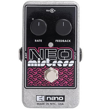 The Electro Harmonix Neo Mistress is a compact flanger pedal inspired by the legendary Electro Harmonix Deluxe Mistress flanger. The Feedback control adjusts how much of the input signal is processed, while the Rate control regulates the intensity of the "flanging." A high-quality flanger at an affordable price.