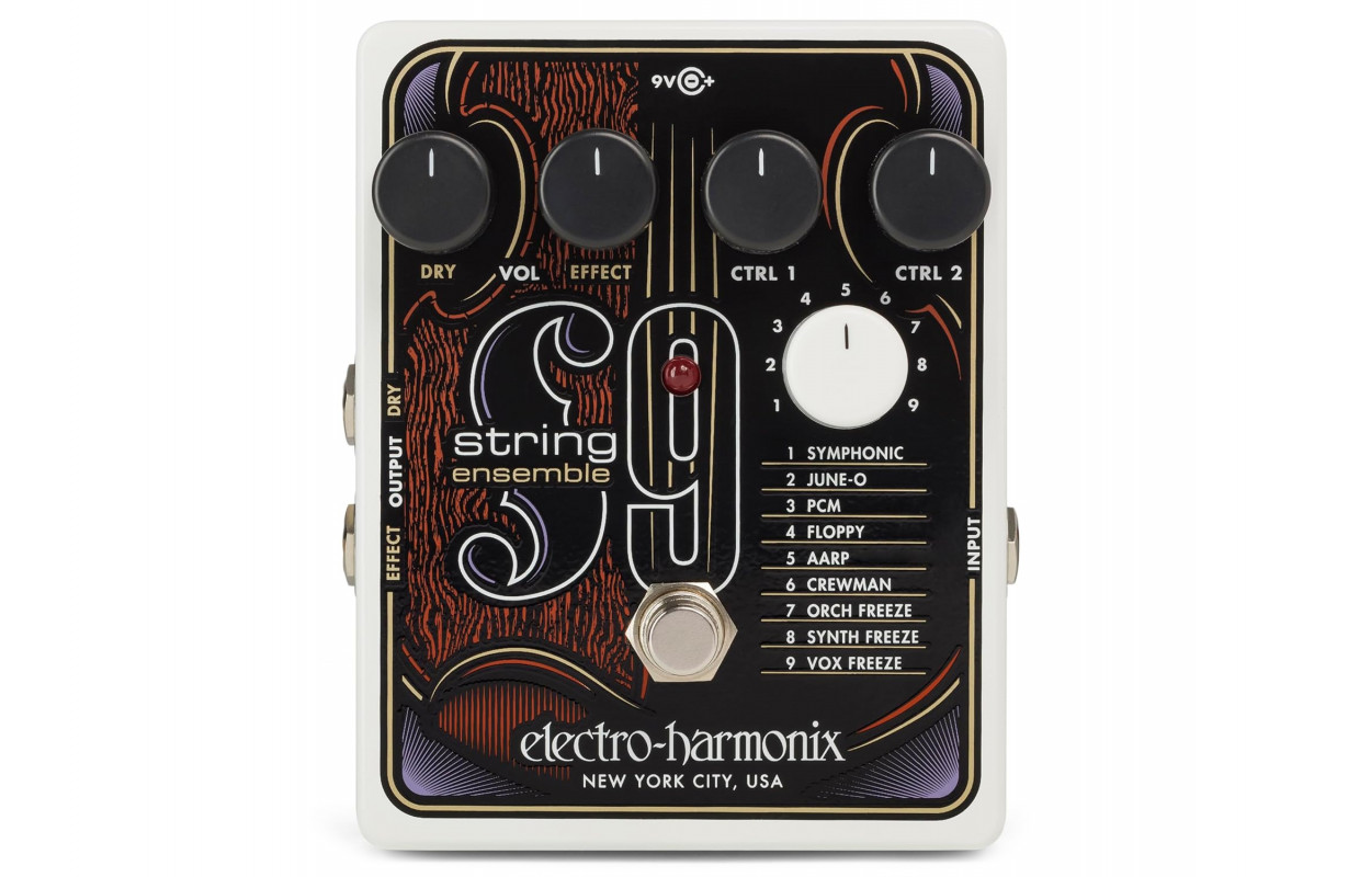 It is based on the same technology that powers all the pedals in the EHX 9 series. For the first time in the 9 series, the String9 includes the signature EHX Freeze effect on 3 of the presets, allowing users to sample and sustain notes and chords infinitely. A rotary switch on the String9 enables the musician to select their preferred sound as follows.