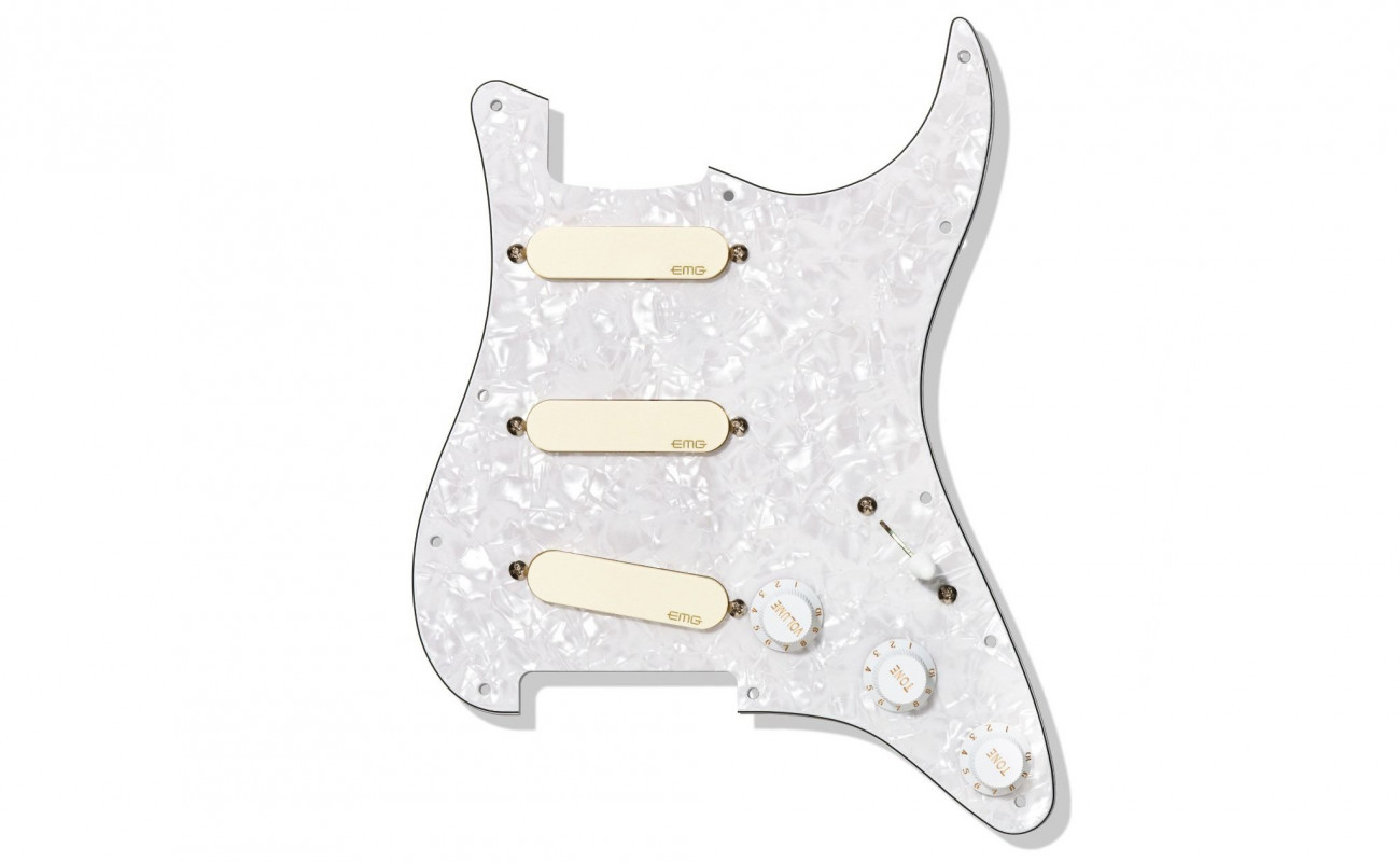 David Gilmour has used this EMG system on his main Strat (the red one) for many years. The DG20 comes equipped with cream SA pickups, wired with an EXG Guitar Expander, an SPC Presence Control, and a master volume – all mounted on a deluxe pearlescent white pickguard with white plastic parts.