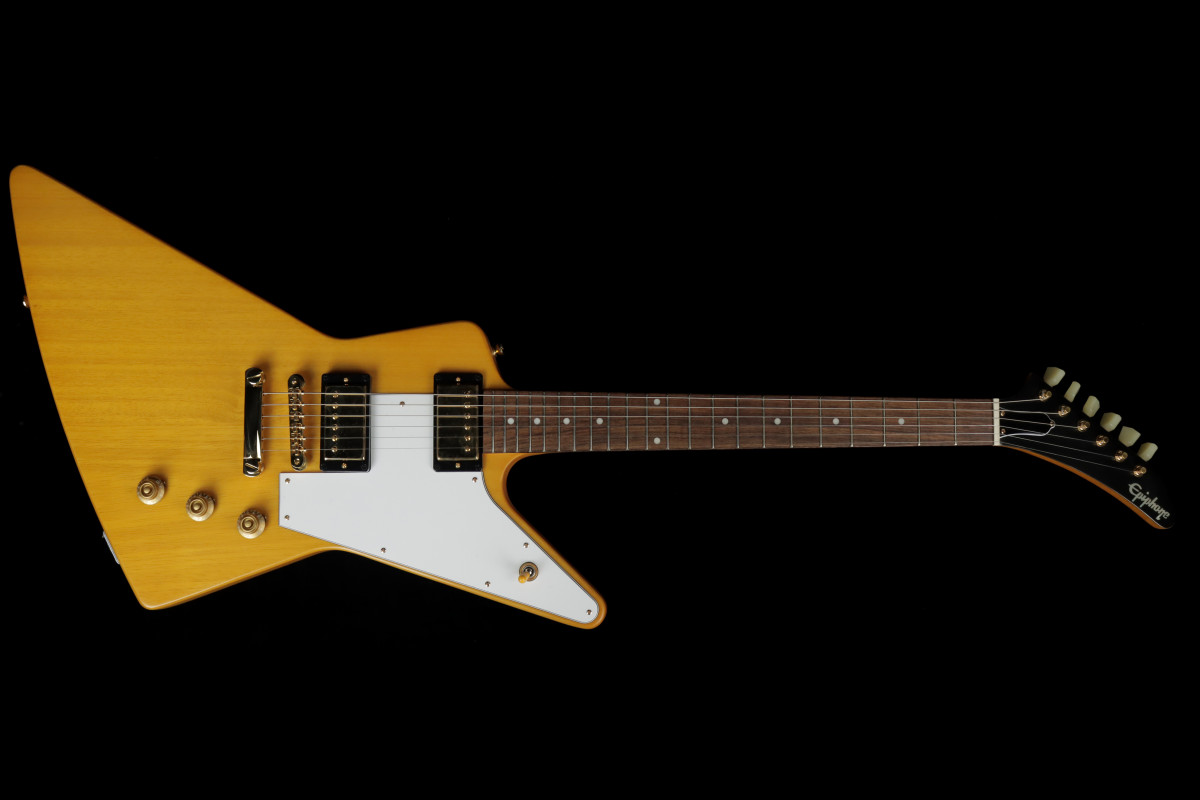 The Epiphone 1958 Korina Explorer features, just like the original, a solid Korina body and neck, an Indian laurel fingerboard, and a neck profile inspired by the 1958 Explorer.