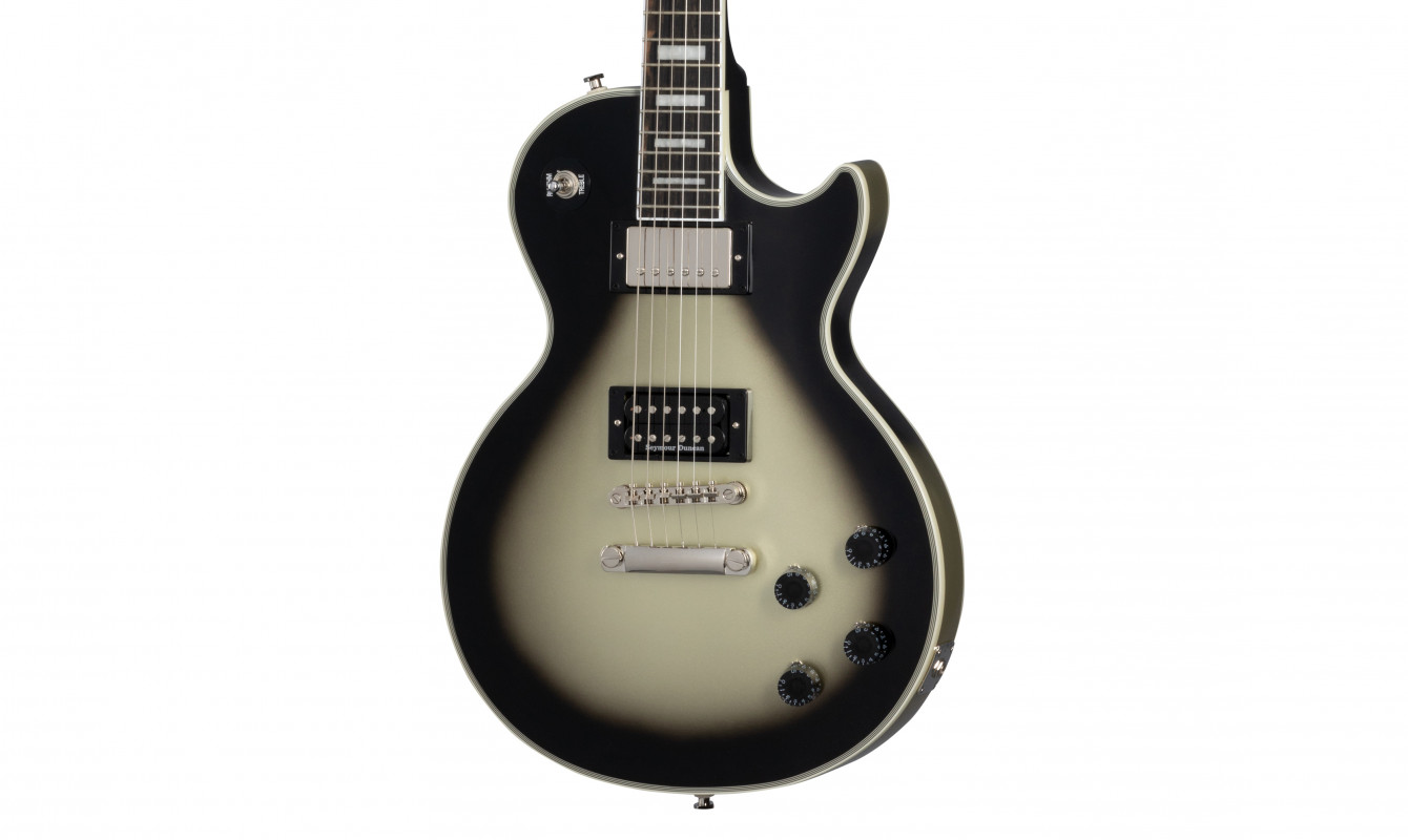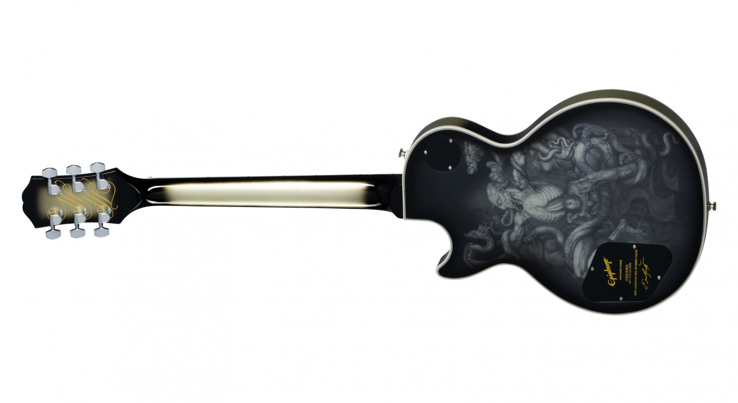 The Epiphone Adam Jones Les Paul Custom Art Collection consists of 7 Les Paul Custom models finished in Antique Silverburst, each featuring a unique graphic on the back, personally curated by Adam Jones in collaboration with five different artists.