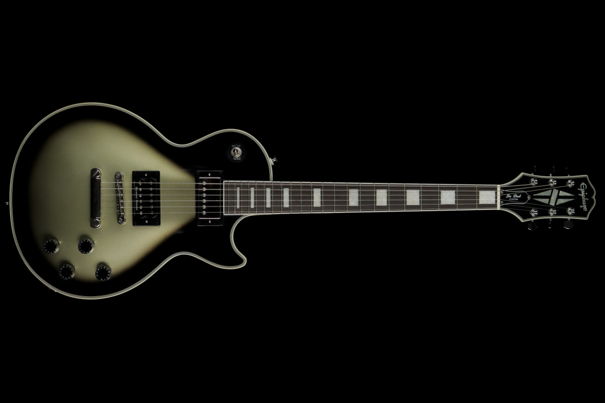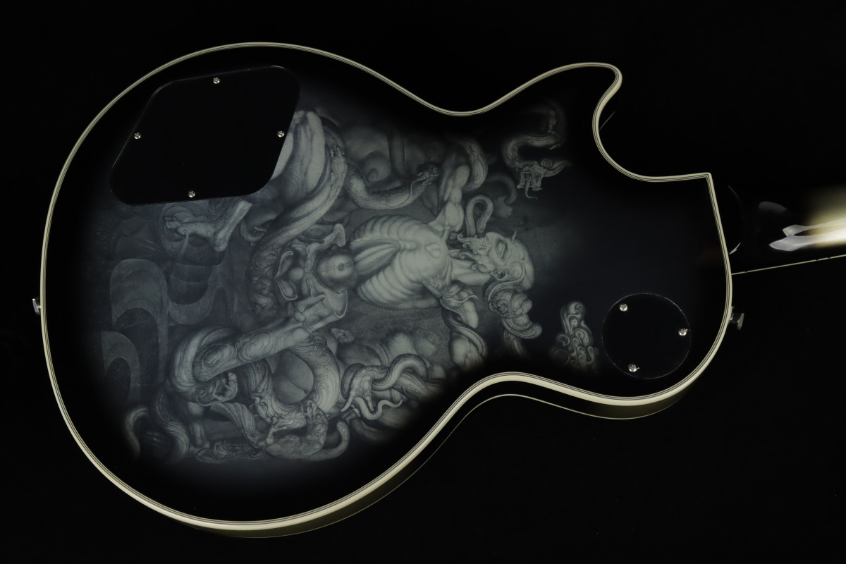 The Epiphone Adam Jones Les Paul Custom Art Collection consists of 7 Les Paul Custom models finished in Antique Silverburst, each featuring a unique graphic on the back, personally curated by Adam Jones in collaboration with five different artists.