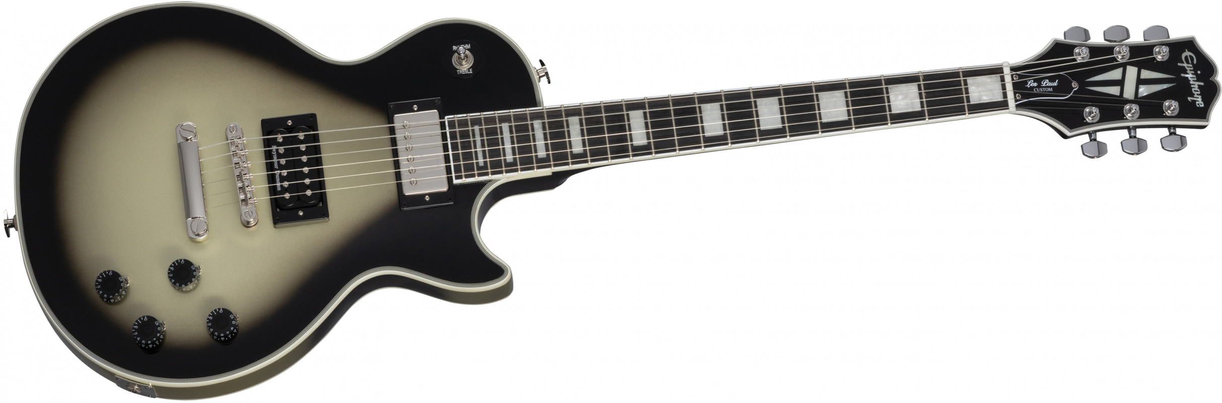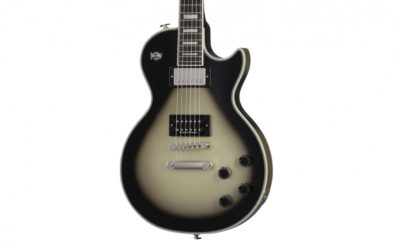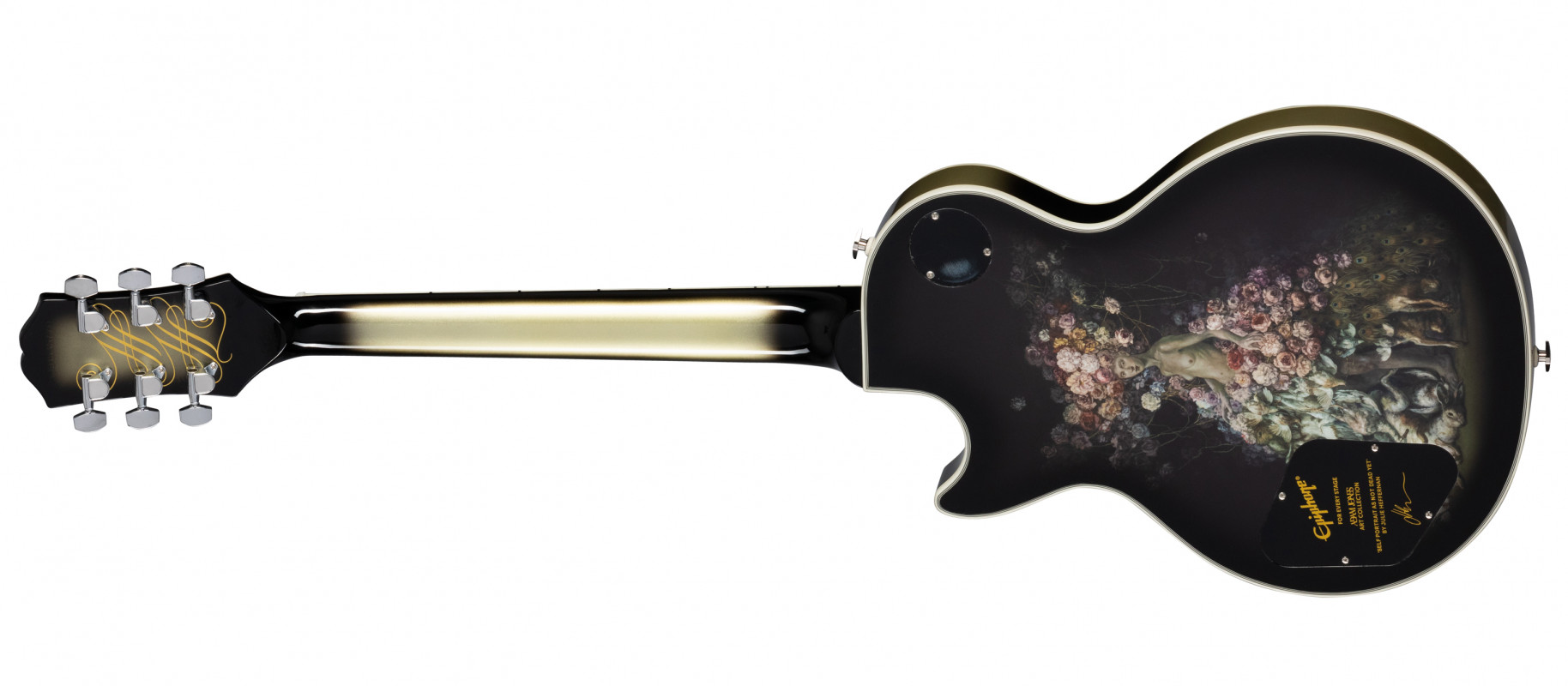 The Epiphone Adam Jones Les Paul Custom Art Collection consists of 7 Les Paul Custom guitars in an Antique Silverburst finish, each featuring a unique graphic on the back, personally curated by Adam Jones in collaboration with five different artists.