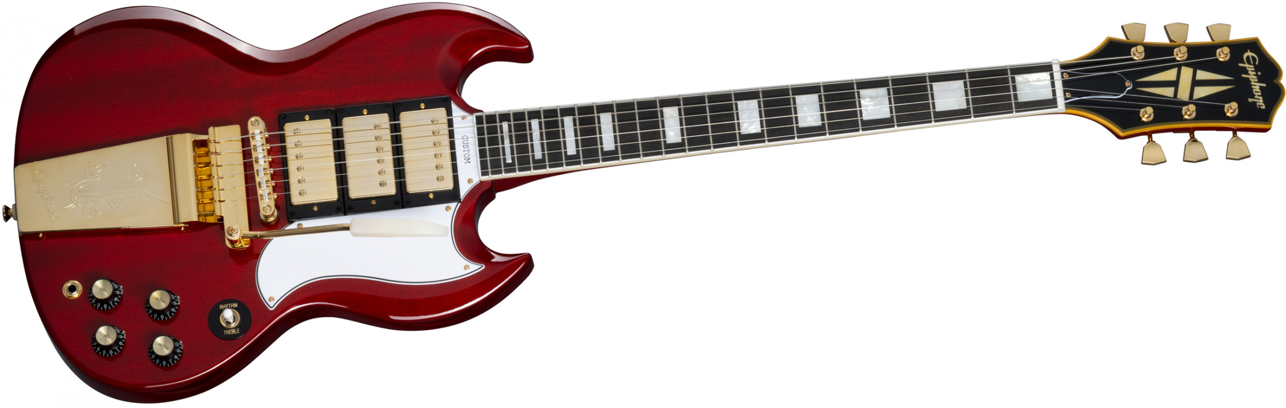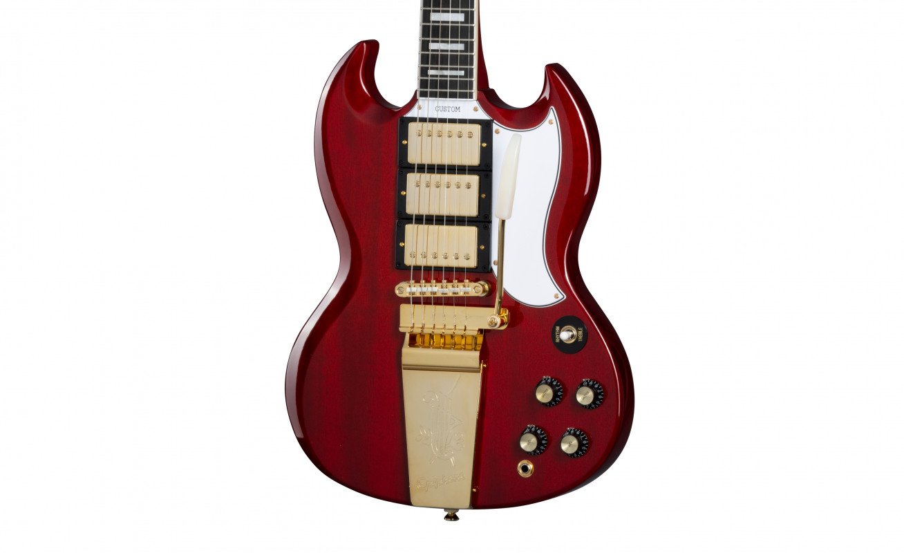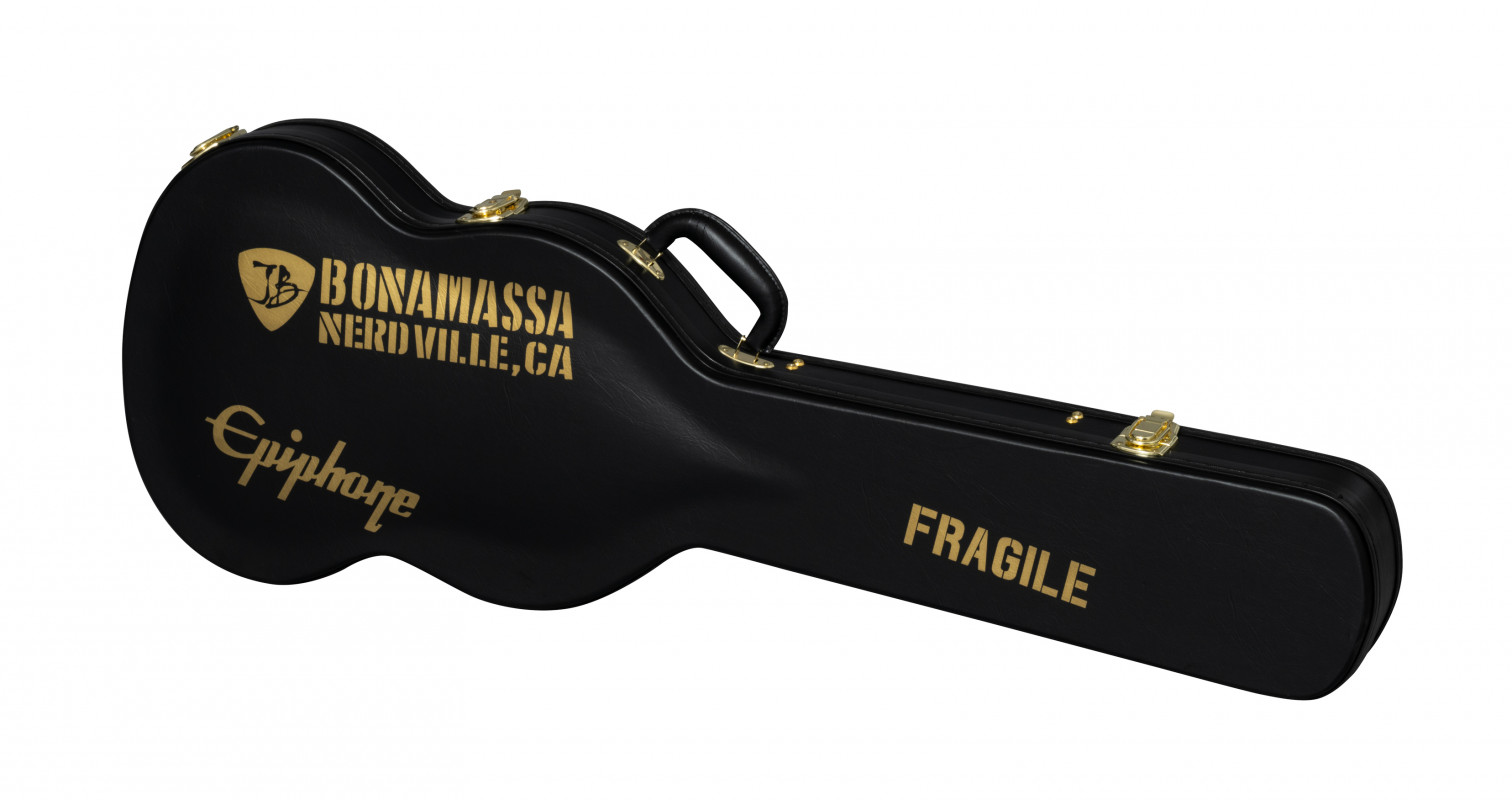 It features the same smooth neck joint contour, a Maestro™ Vibrola™, classic SG Custom cosmetics, gold-plated hardware, and three powerful Epiphone ProBucker™ pickups. It comes with a Custom Hardshell case with a goldenrod plush interior and Epiphone and Joe Bonamassa exterior graphics, and a certificate of authenticity.