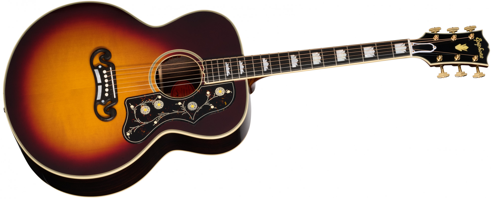 To meet the needs of modern guitarists, the Epiphone Pre-War SJ-200 Rosewood Reissue is equipped with an L.R. Baggs™ Element Bronze VTC system featuring a piezo under-saddle pickup and an active preamp with volume and tone controls mounted in the soundhole, making it stage and studio ready.