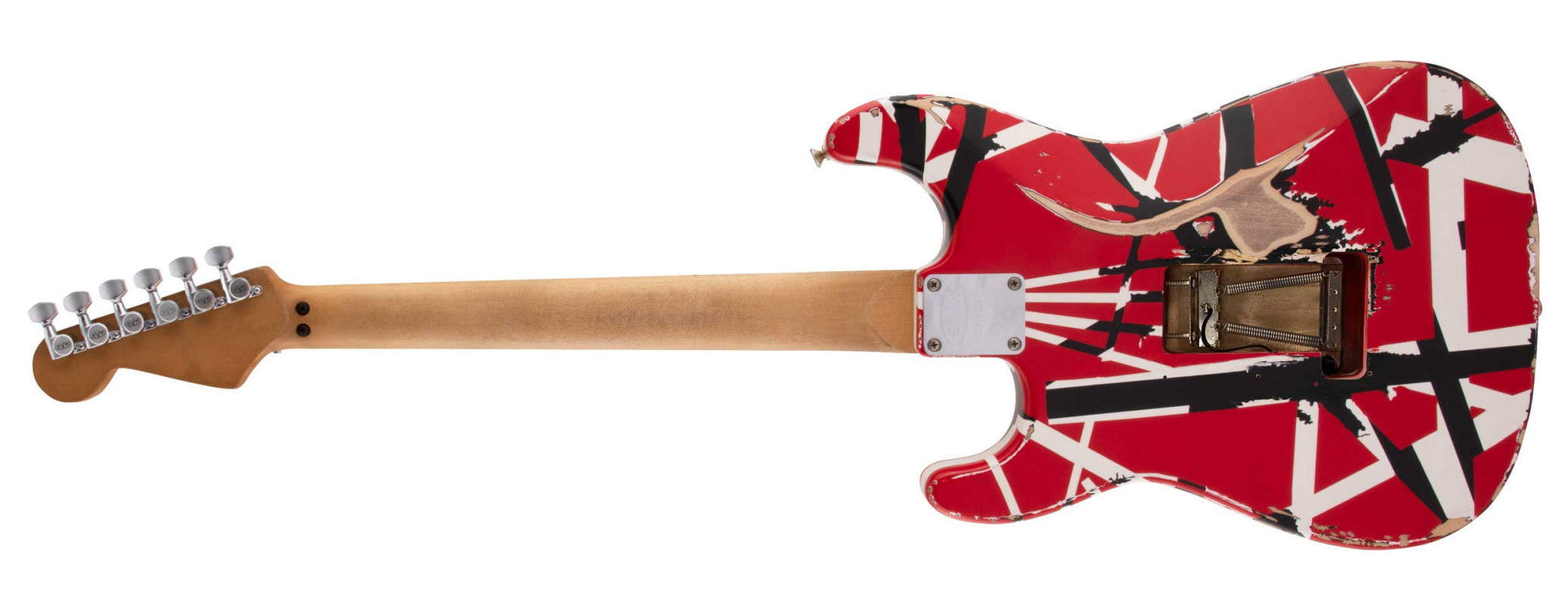 Sporting Eddie’s famed red with white-and-black-striped paint job and a worn-in reliced look, the all-new Frankie features a basswood Stratocaster®-style body paired to a graphite-reinforced quartersawn maple neck. An oiled finish on the back of the neck allows for hours of playing comfort, while the 12”-16” compound radius maple fingerboard with 22 jumbo frets was designed for fast and furious playing styles.