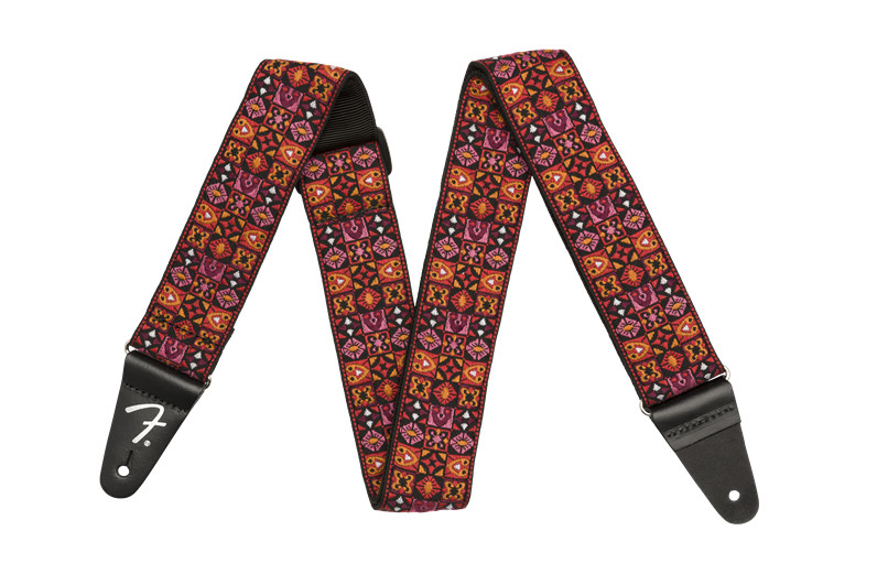 Vintage-inspired strap featuring a decorative mosaic fabric design, leather ends, and the Fender logo.