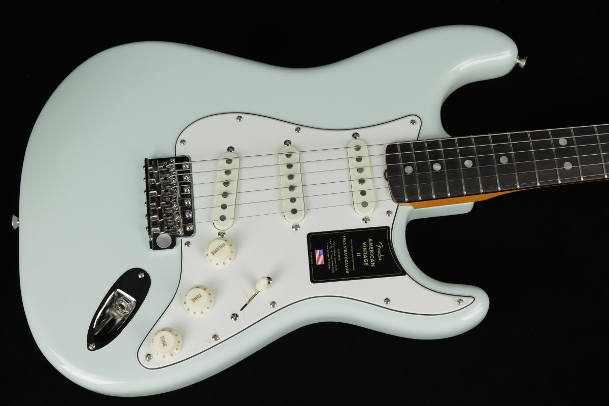 The Fender American Vintage II 1965 Stratocaster reintroduces the original instrument produced in the mid-1960s and is characterized by an alder body, a maple neck with a fast 1965 "C" profile, a rosewood fingerboard with a 7.25" radius, a Vintage Synchronized Tremolo bridge with an inertia block, and Pure Vintage '65 Gray-Bottom Single-Coil Strat® pickups.
