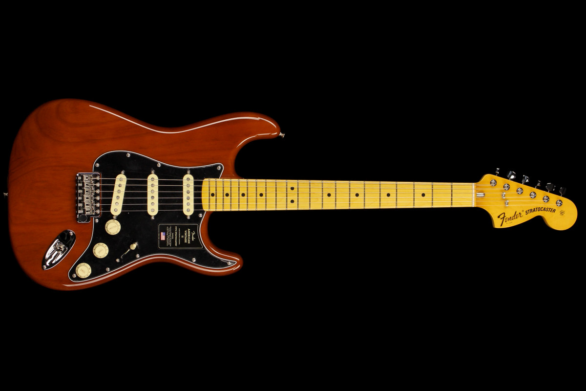 The American Vintage II 1973 Stratocaster® exudes the spirit of the era and is outfitted with a trio of Pure Vintage '73 staggered pole pickups, a large headstock with dual string trees, a convenient “Bullet” style truss rod nut and a three-bolt neck plate with Micro-Tilt™ mechanism. The “C”-shape maple neck plays like a dream with a 7.25” radius rosewood or maple fingerboard and vintage tall frets. The guitar is offered in three classic colors over ash: Aged Natural, Lake Placid Blue and Mocha, the latter being the first custom color ever to feature a black pickguard on a Strat®. Additional features include vintage-style “F” stamped tuners and a synchronized tremolo with bent steel saddles and cold rolled steel block.