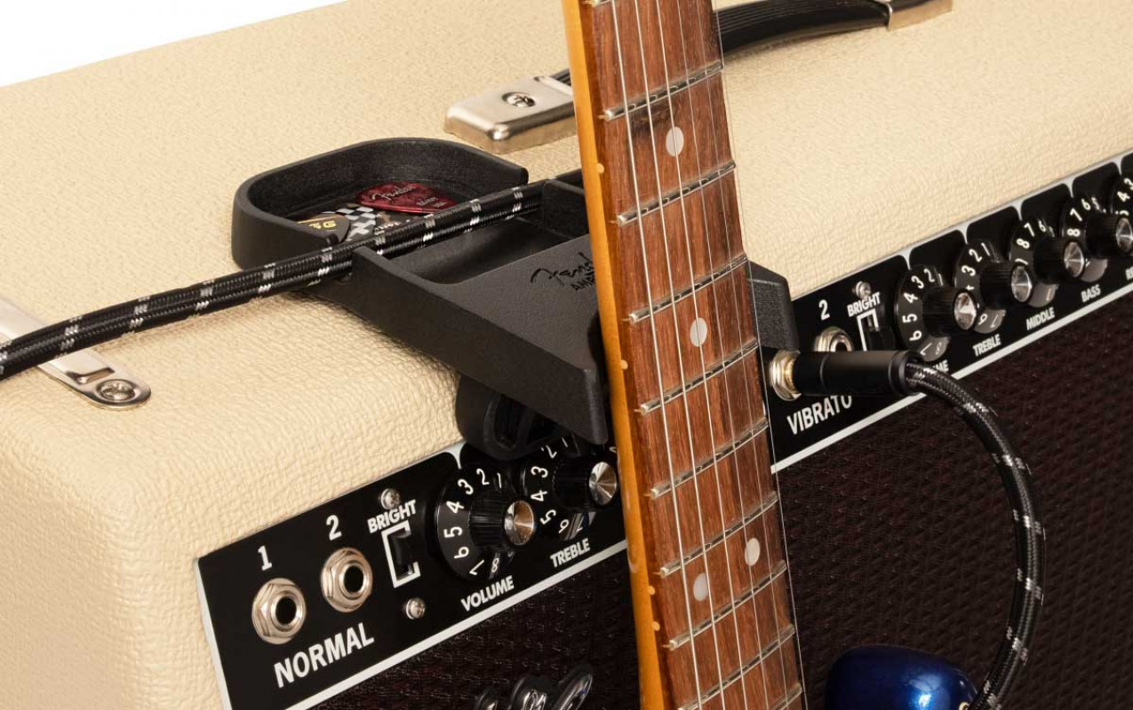 The Amperstand Cradle also includes a classic Fender "ashtray" to comfortably hold small items like picks. The two grooves on the sides will keep the guitar cable in position.