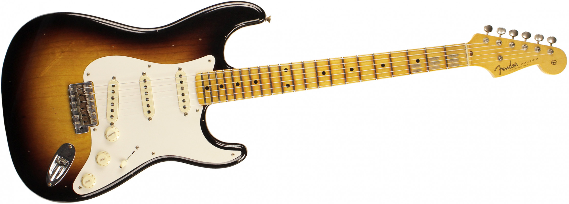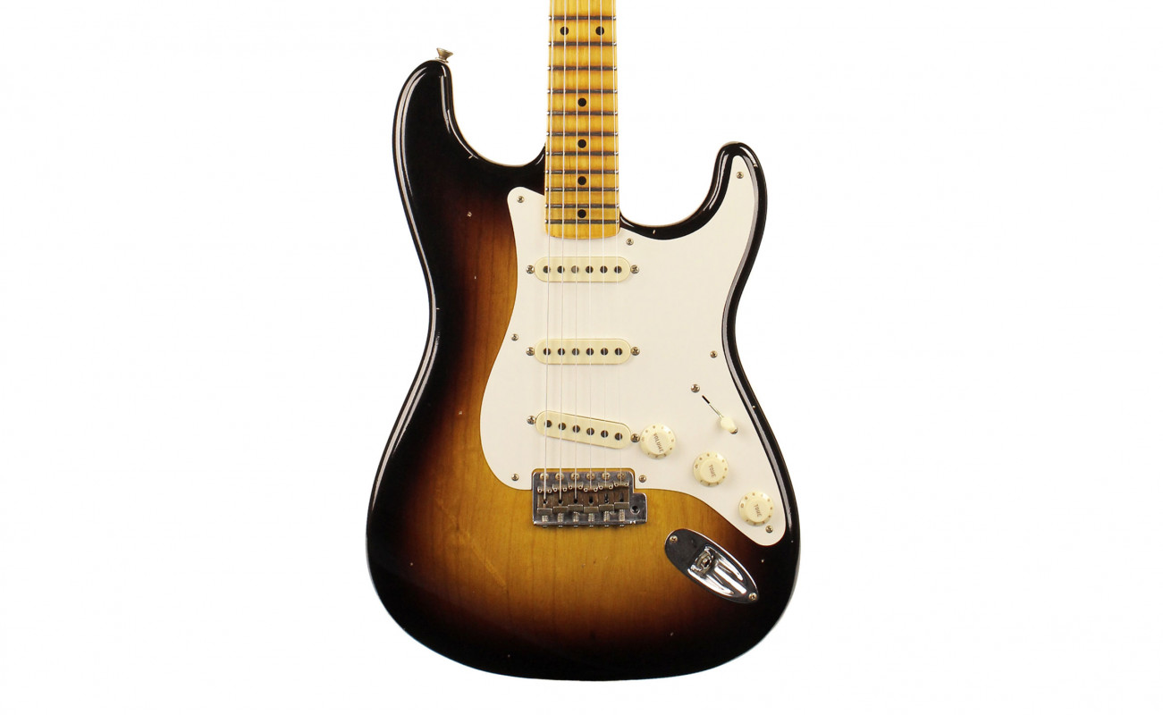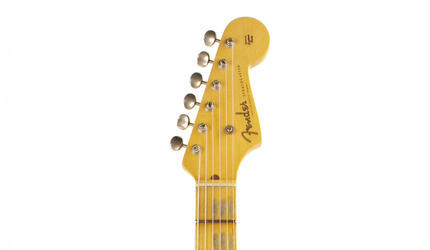 The one-piece flat-sawn maple neck has a chunky ’54-style Soft “V” profile, topped by a comfortable vintage compound-radius (7.25”-9.5”) maple fingerboard that flattens slightly toward the nut for easy bending, with 21 medium vintage (47095) frets and a bone nut. All three Custom Shop hand-wound ’55 Strat® pickups (reverse-wound/reverse-polarity middle pickup for hum cancellation in switch positions 2 and 4) deliver crystal-clear highs and well-balanced midrange, with ’54-’58 vintage Strat wiring and five-way switching.