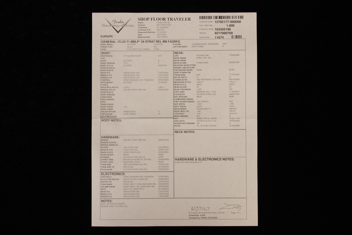 This Fender Custom 1959 Stratocaster Relic Masterbuilt Levi Perry features highly selected materials and interesting specs which lead to an extremely versatile instrument.