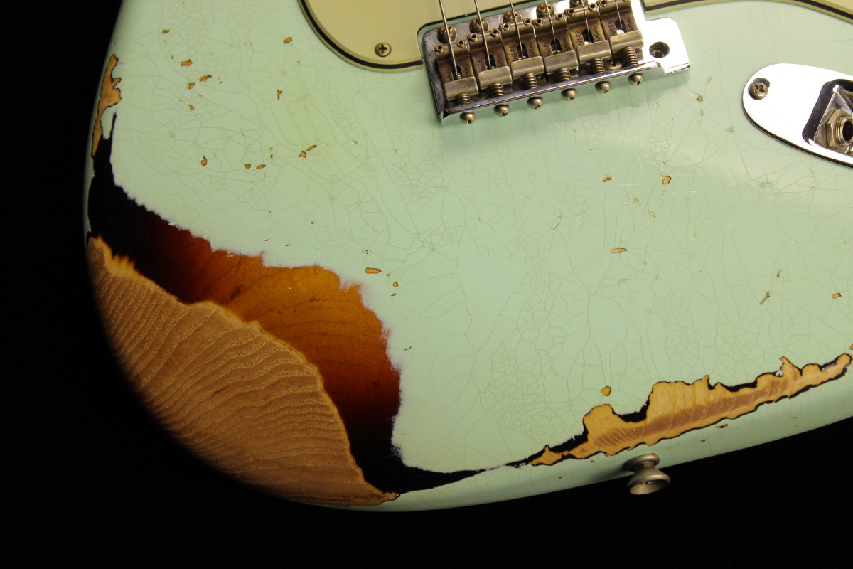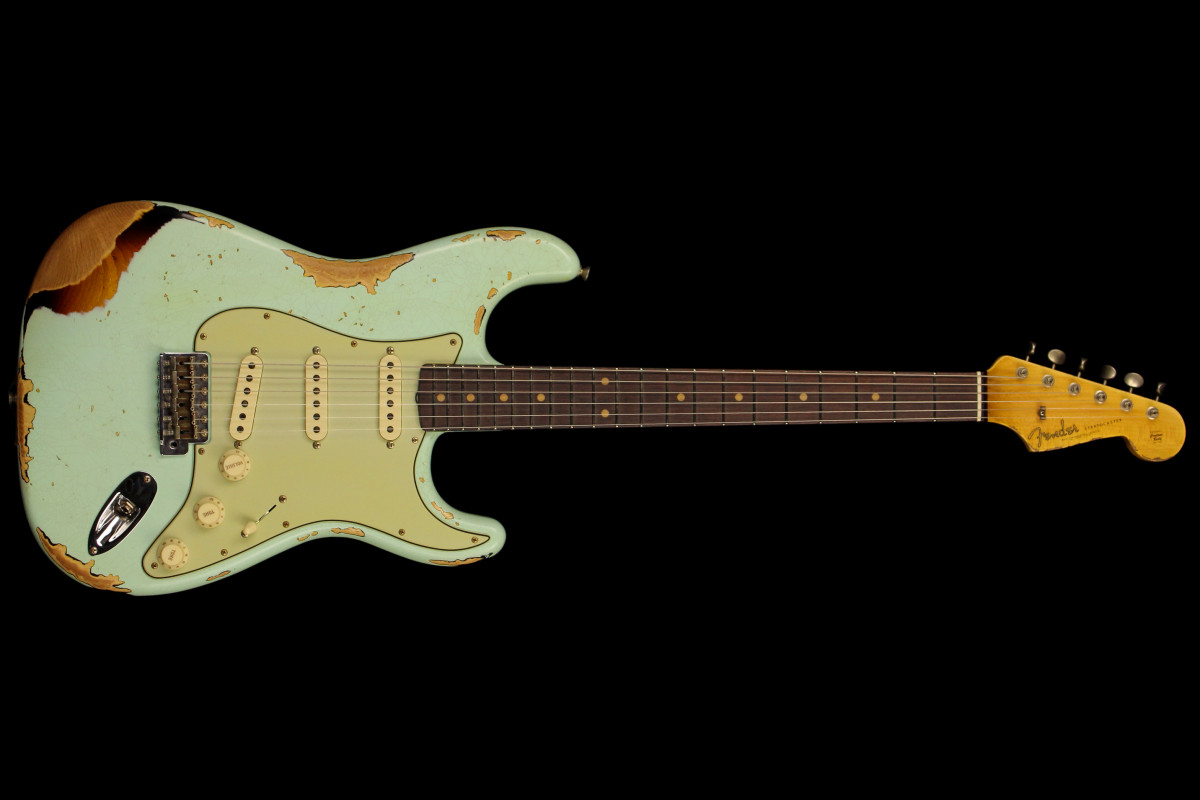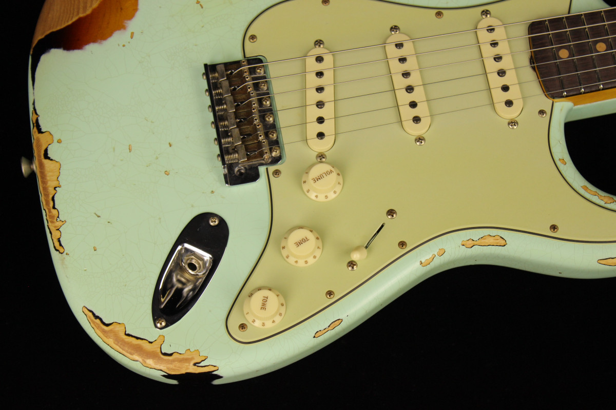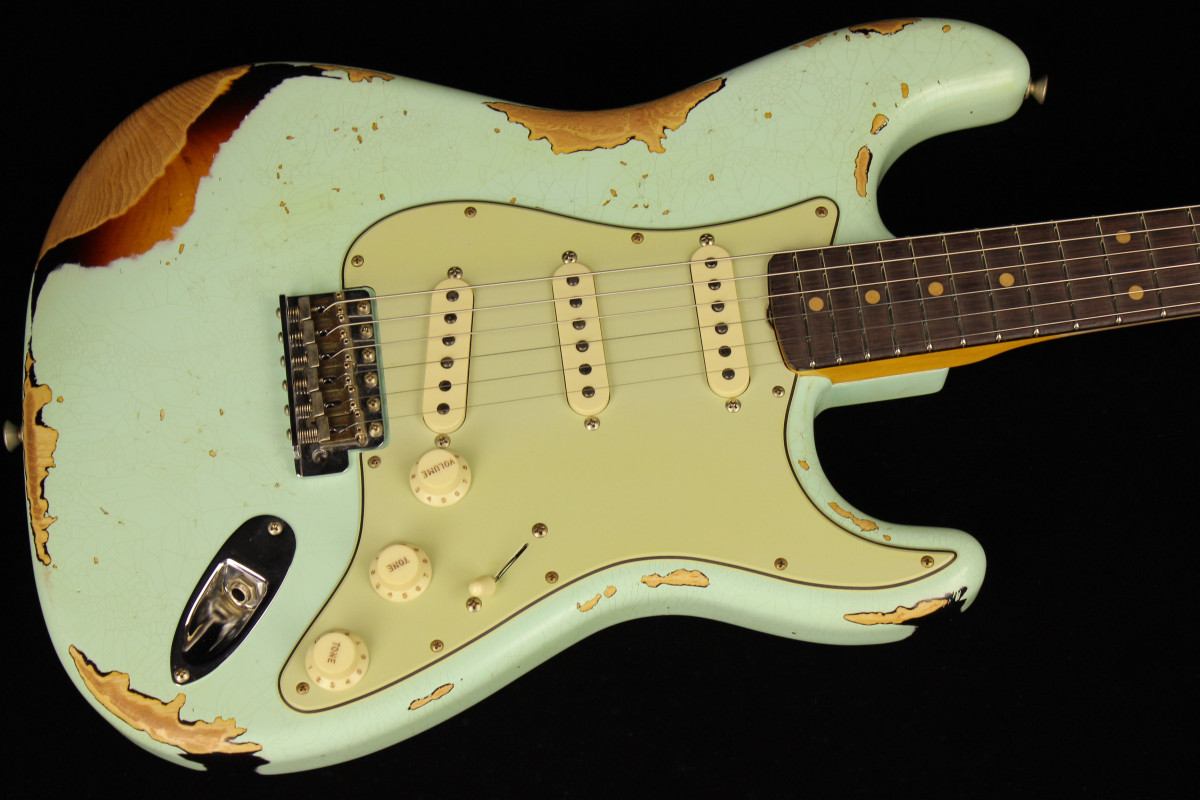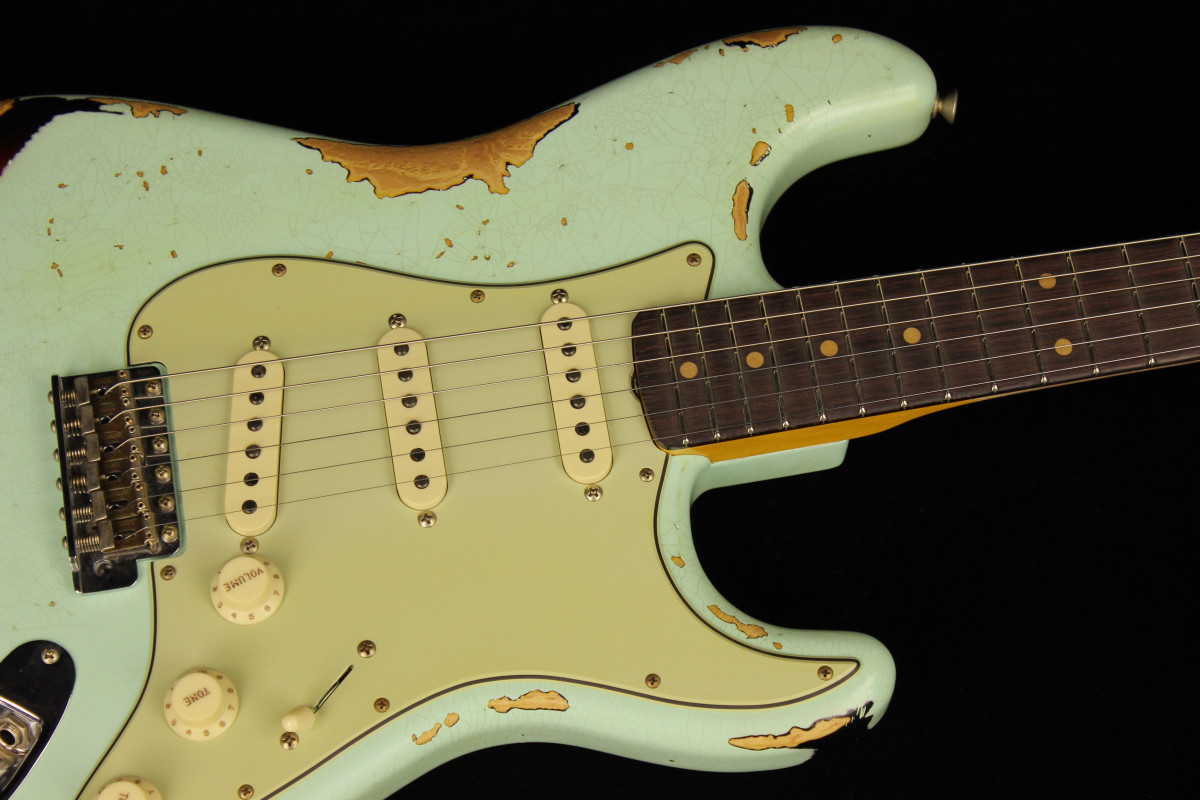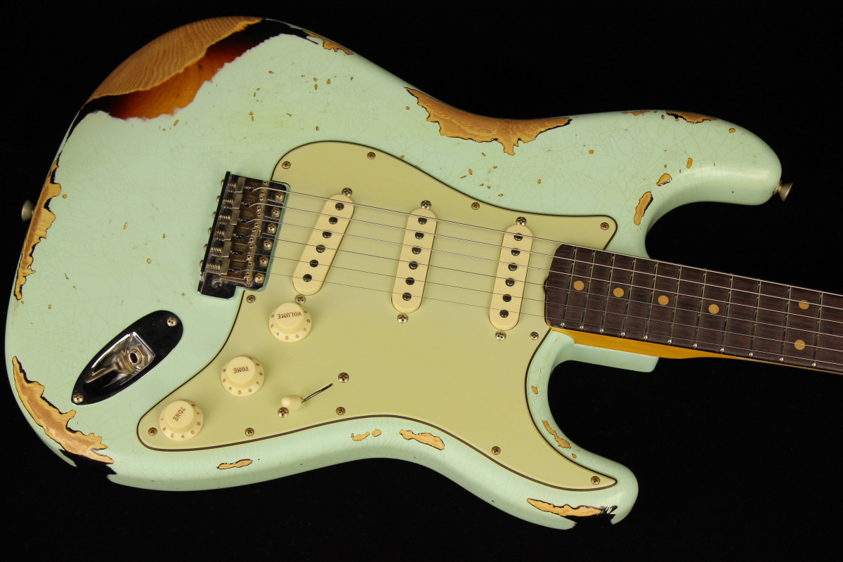 This Fender Custom 1962 Stratocaster Heavy Relic in a stunning Surf Green over 3-Color Sunburst finish was ordered by Gino Guitars as Custom Order.