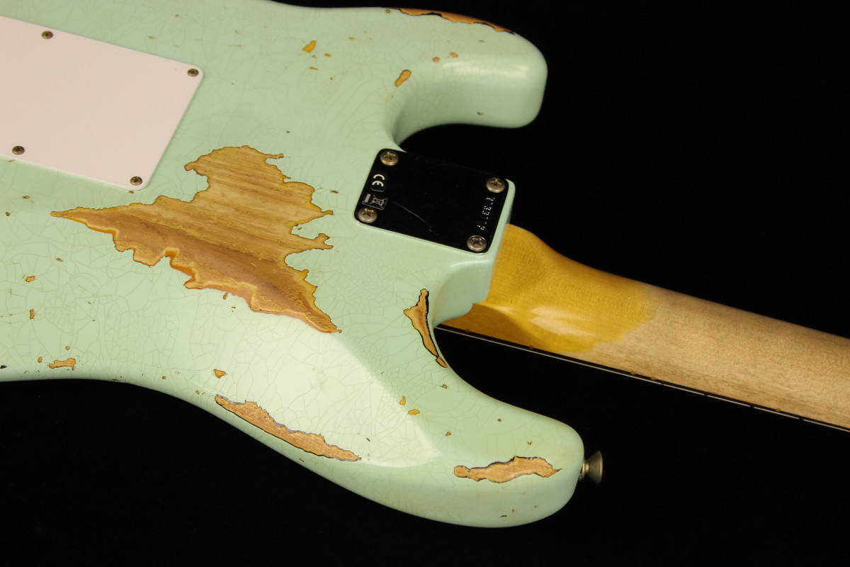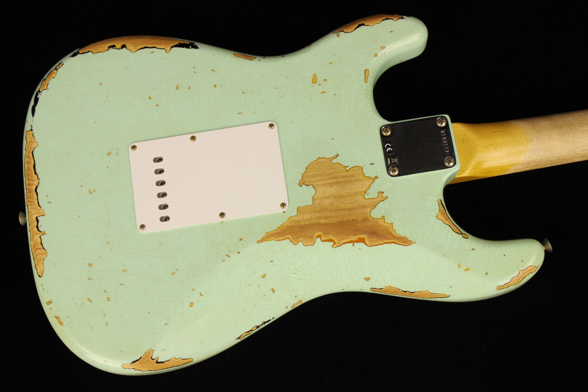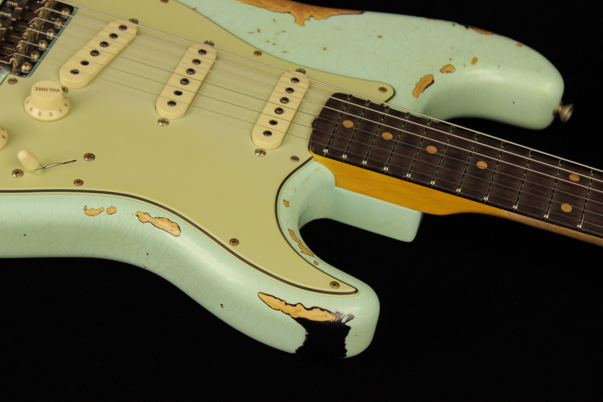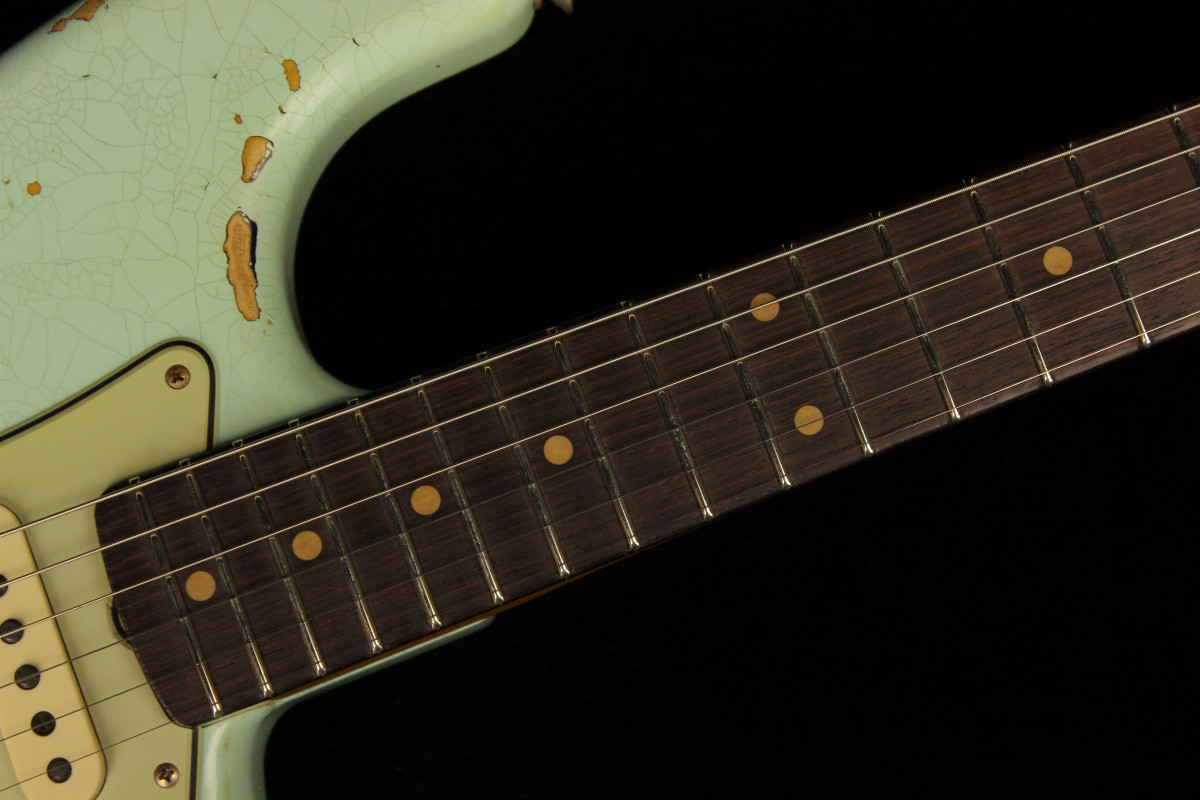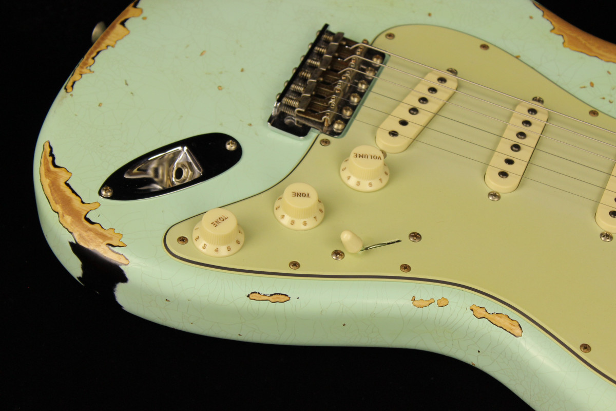 This Fender Custom 1962 Stratocaster Heavy Relic in a stunning Surf Green over 3-Color Sunburst finish was ordered by Gino Guitars as Custom Order.