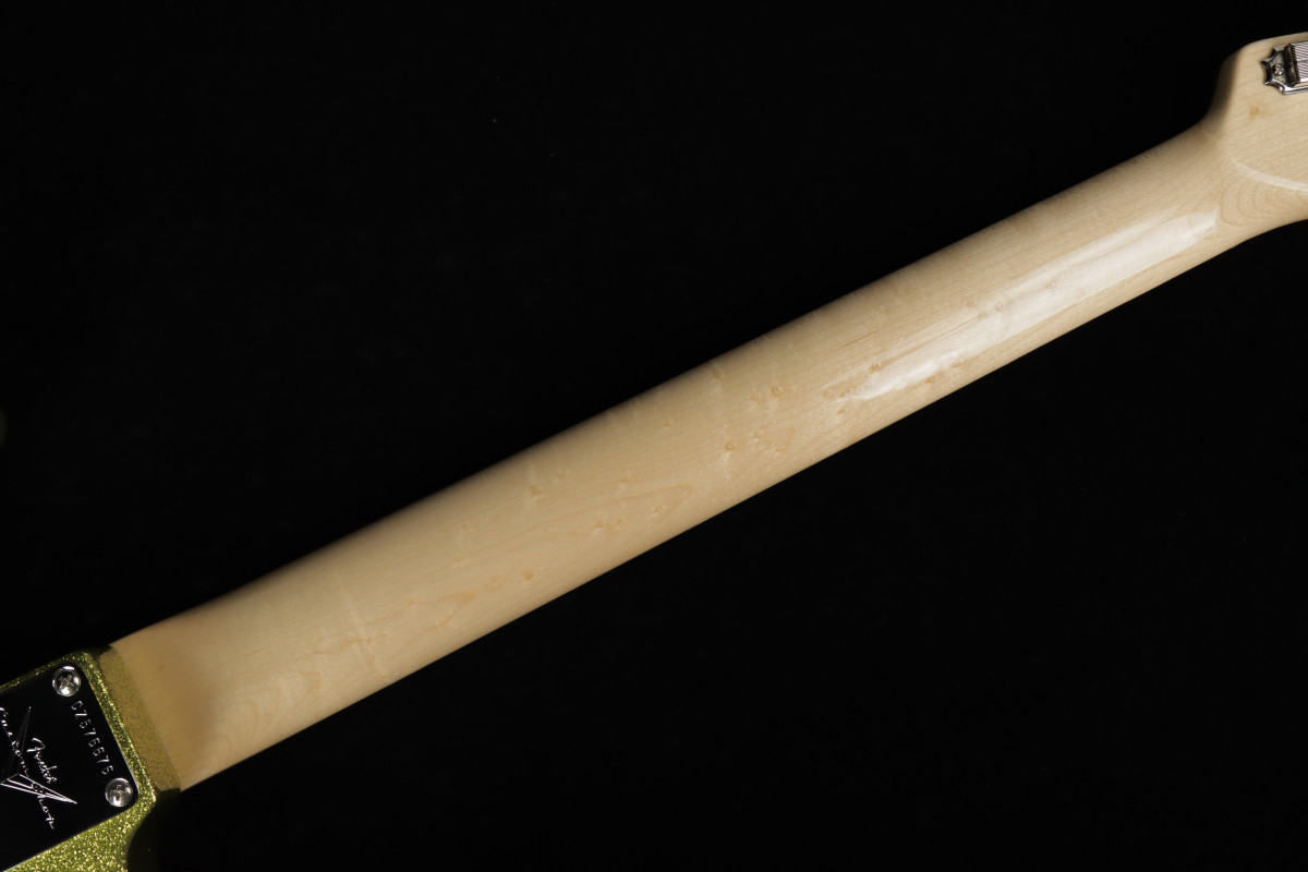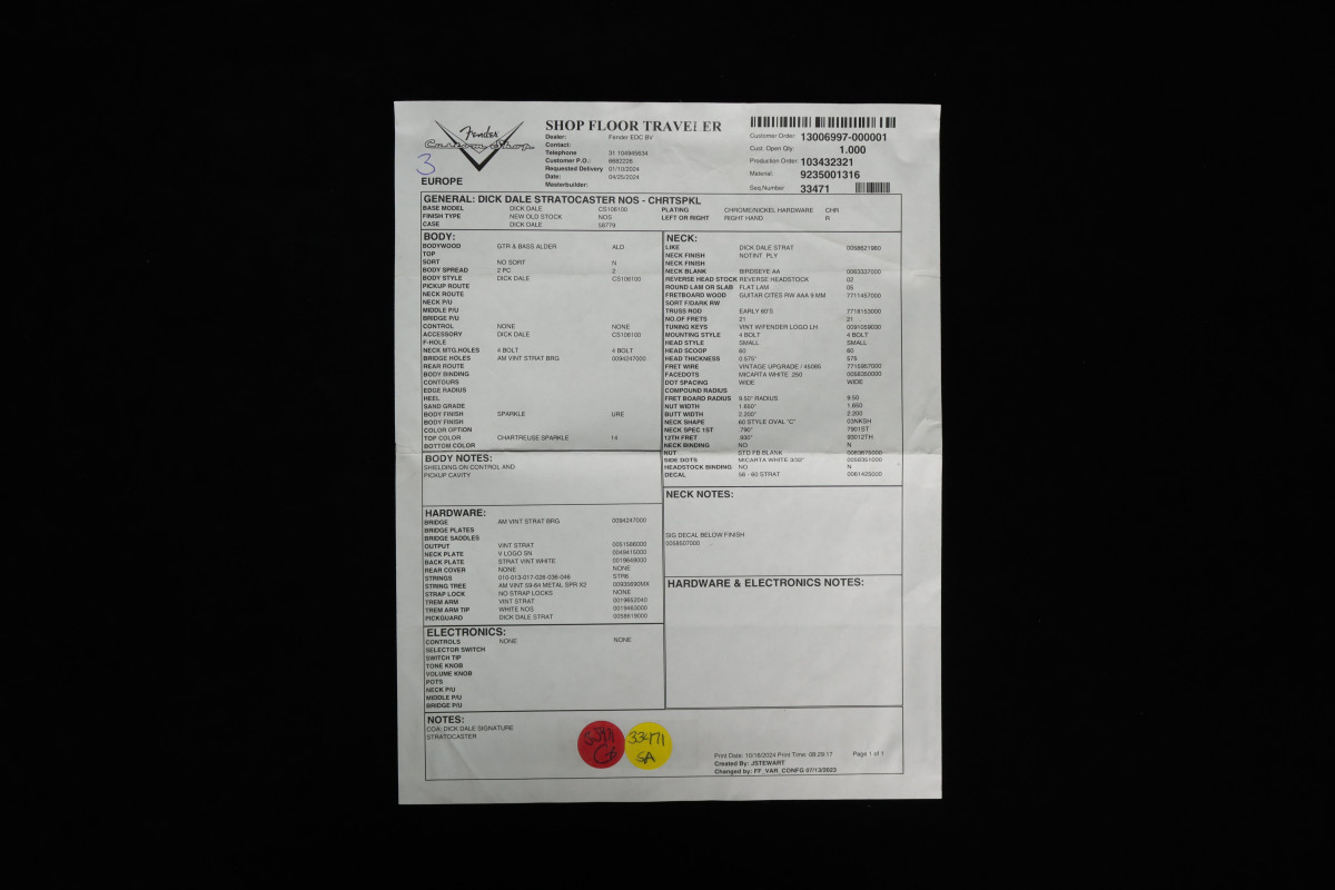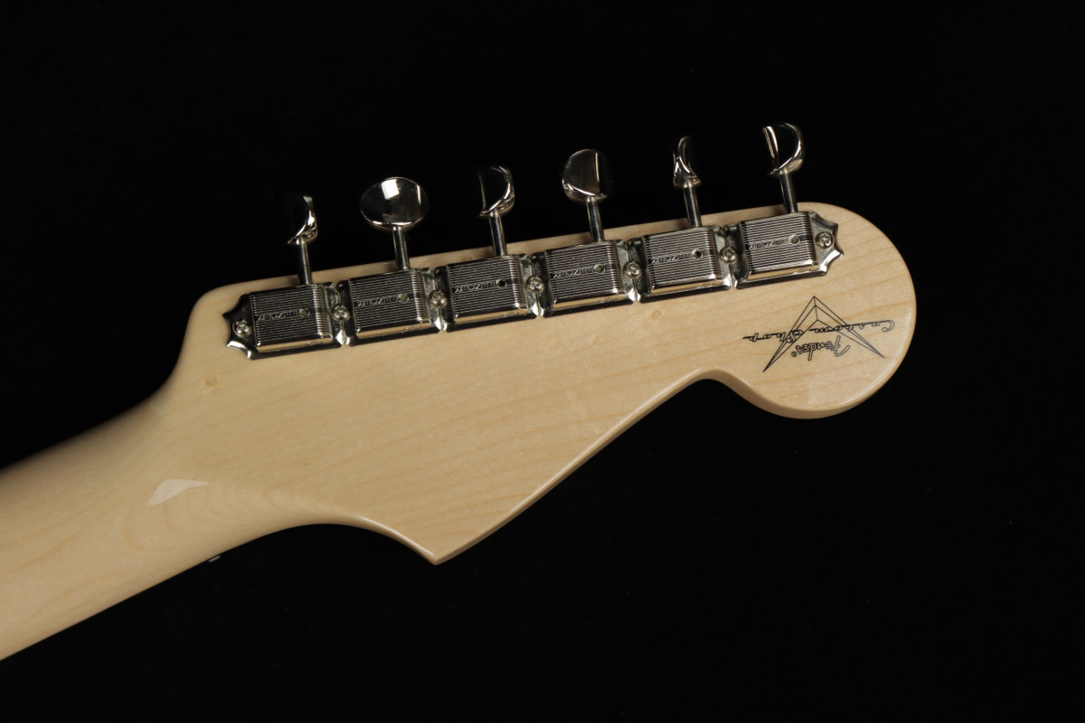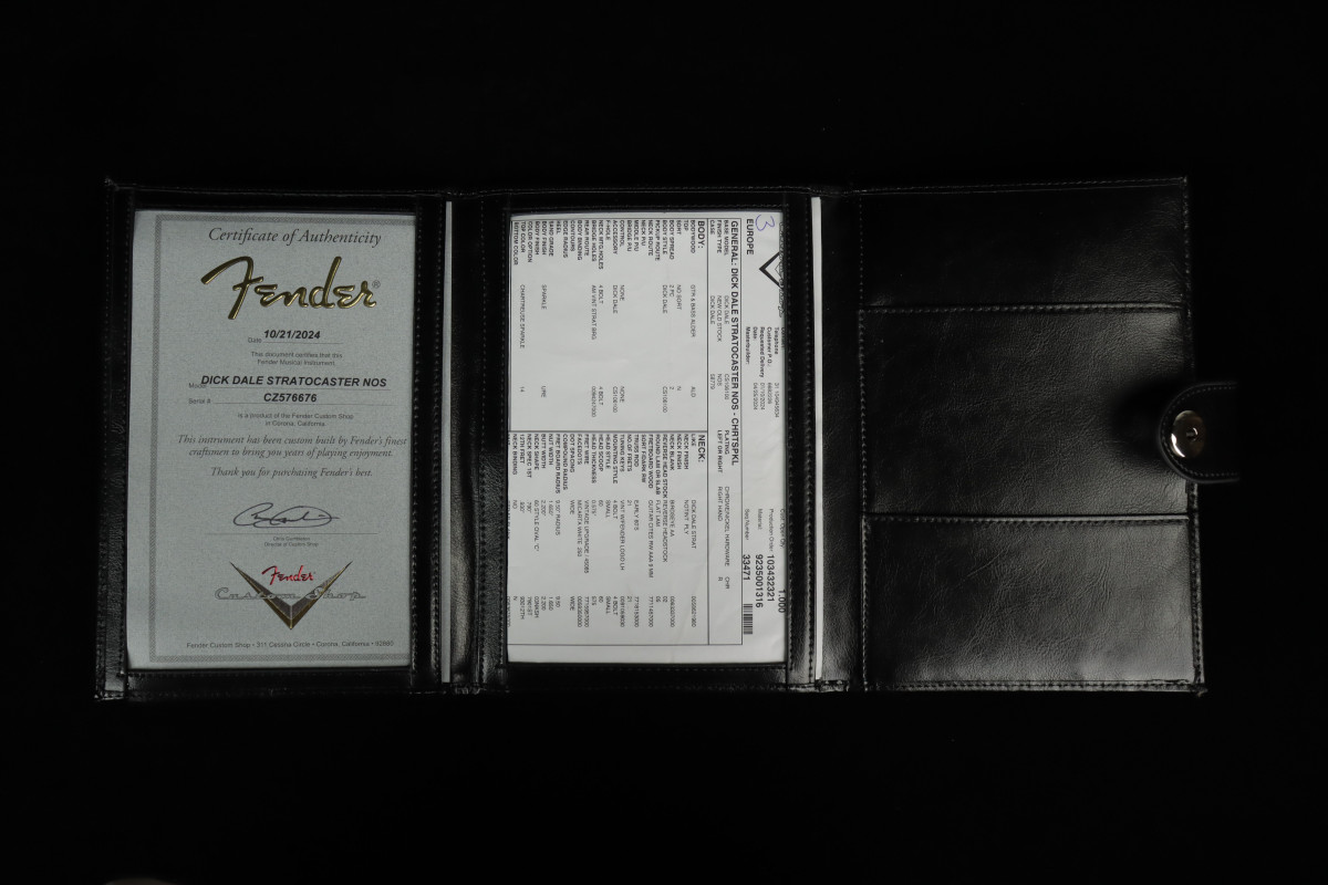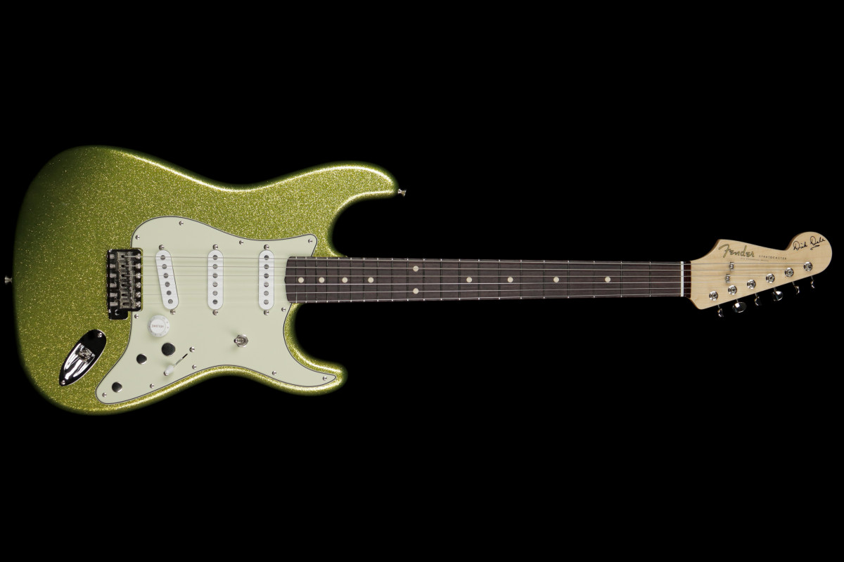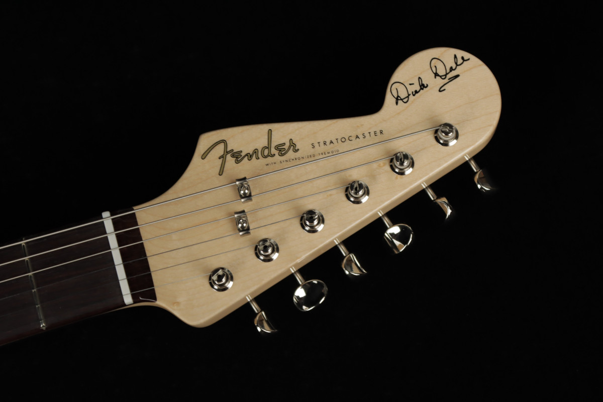 The Fender Custom Dick Dale Signature Stratocaster honors the sound and style of the king of "Surf Guitar," featuring a lightweight alder body, a maple neck with a reverse headstock, a rosewood fingerboard, three Custom Shop '50s Single-Coil Strat® pickups with special switching, a master volume, and an American Vintage Synchronized Tremolo bridge.