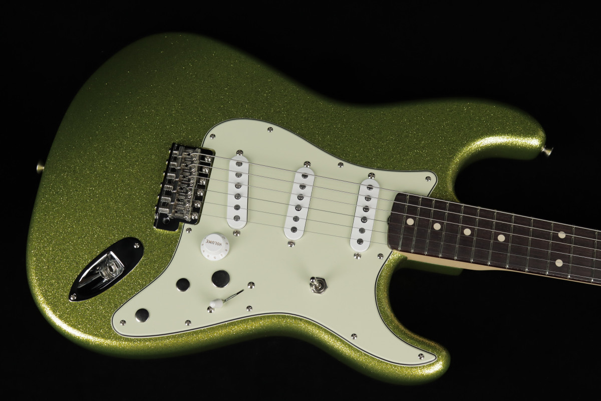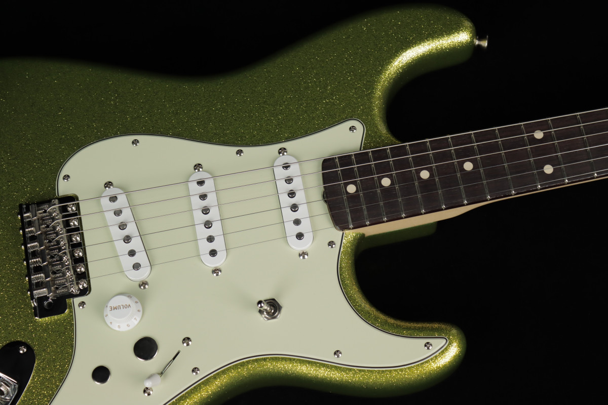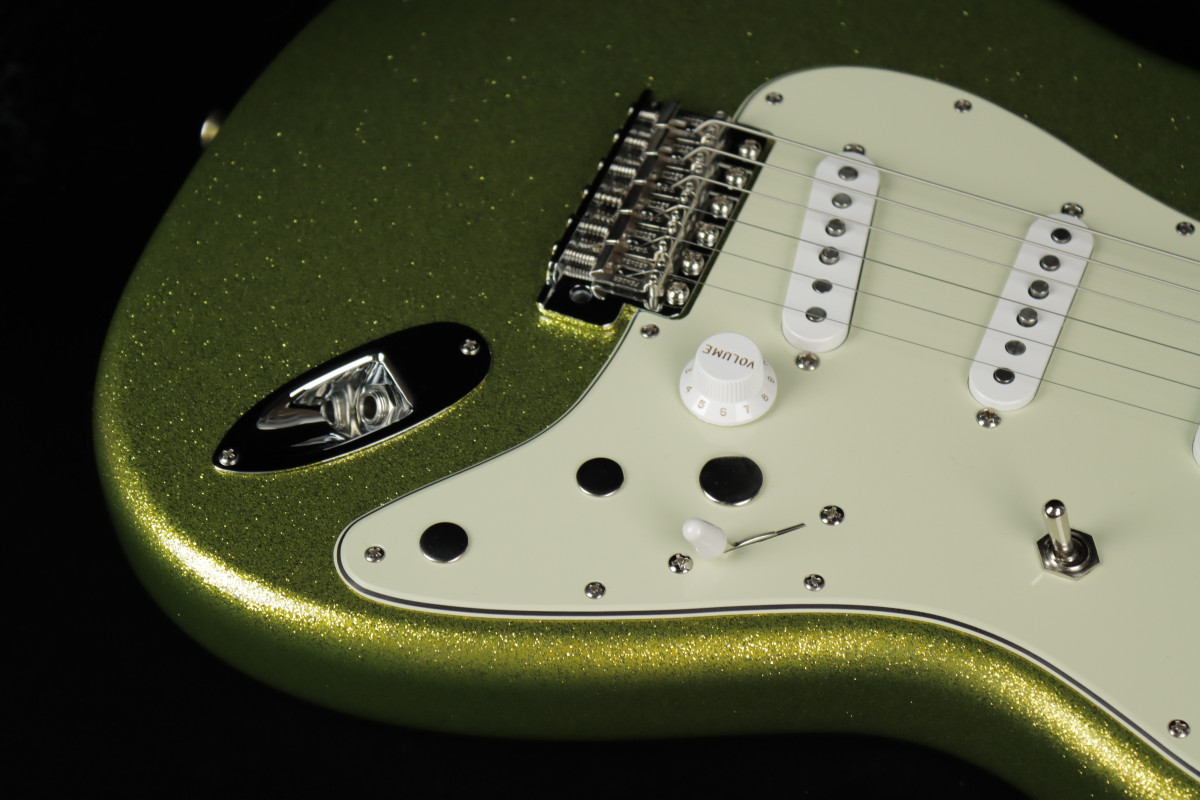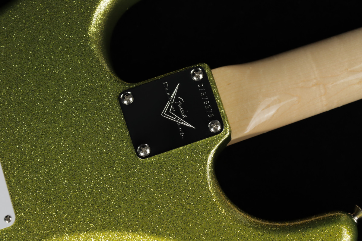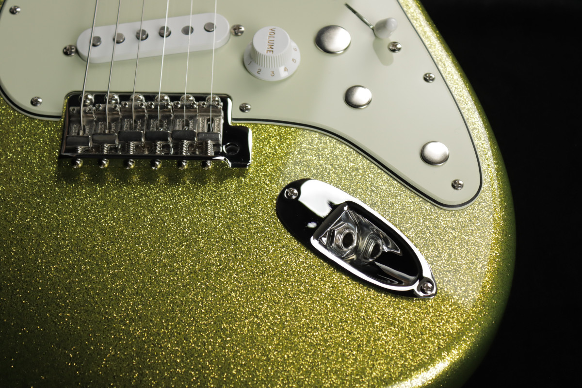 The Fender Custom Dick Dale Signature Stratocaster honors the sound and style of the king of "Surf Guitar," featuring a lightweight alder body, a maple neck with a reverse headstock, a rosewood fingerboard, three Custom Shop '50s Single-Coil Strat® pickups with special switching, a master volume, and an American Vintage Synchronized Tremolo bridge.