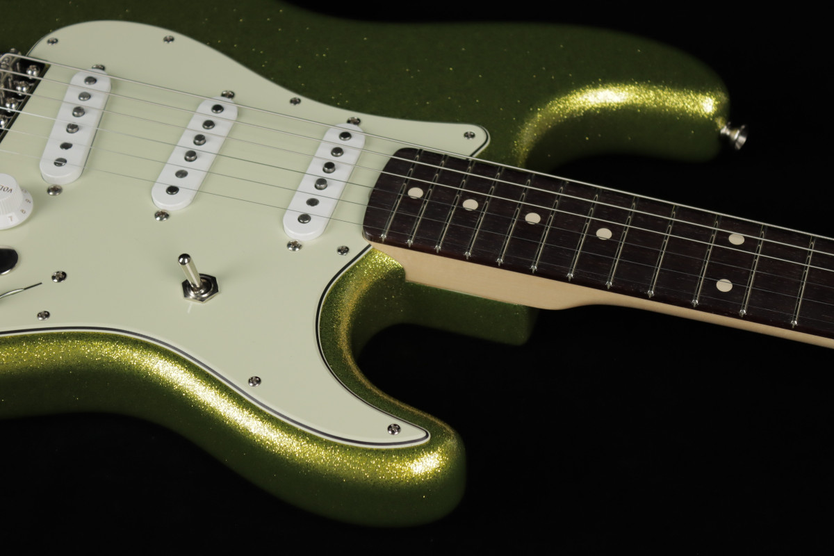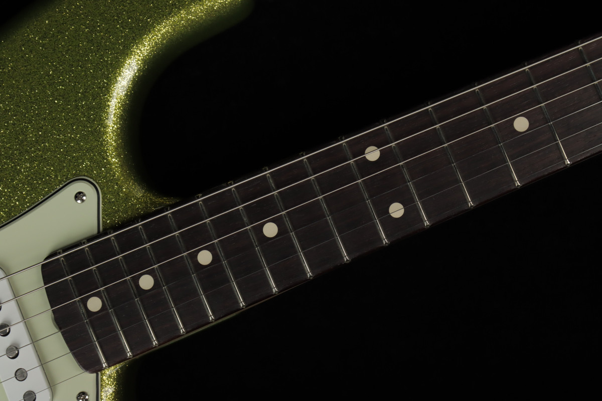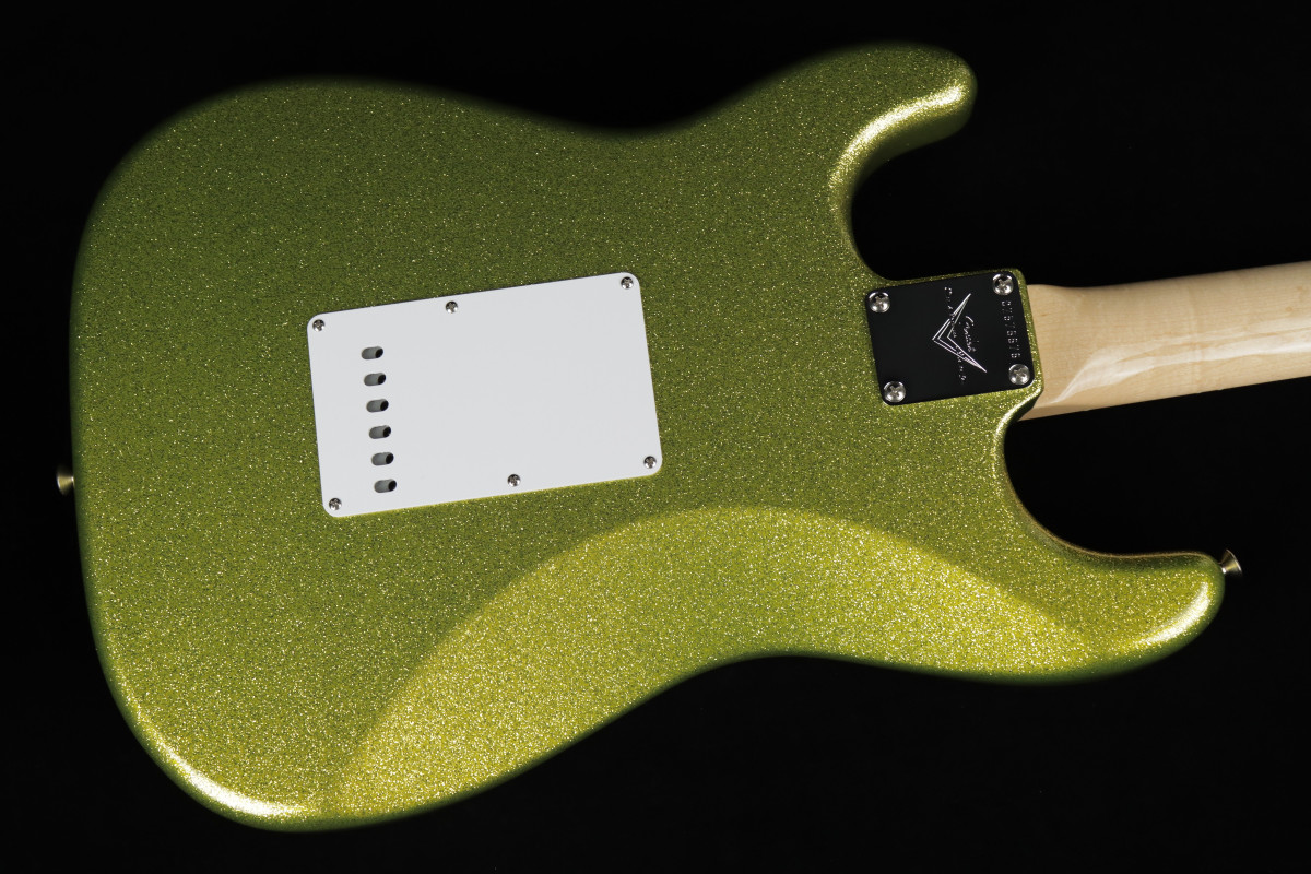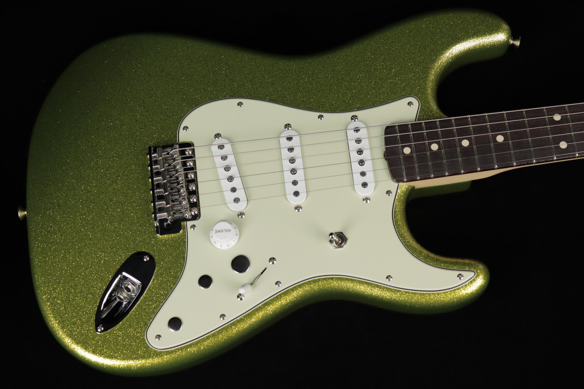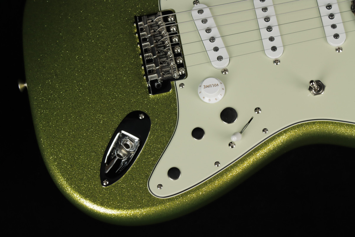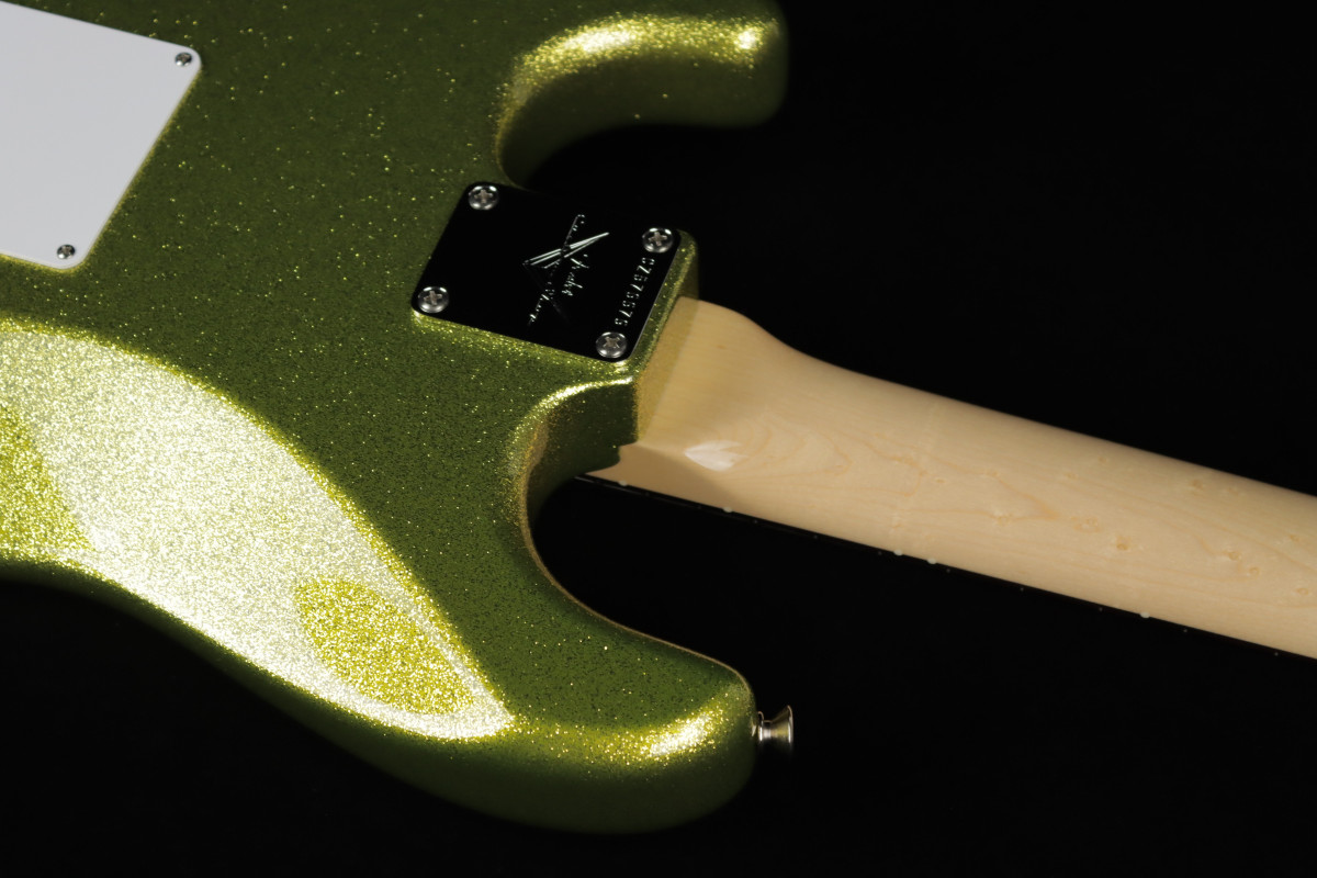 The Fender Custom Dick Dale Signature Stratocaster honors the sound and style of the king of "Surf Guitar," featuring a lightweight alder body, a maple neck with a reverse headstock, a rosewood fingerboard, three Custom Shop '50s Single-Coil Strat® pickups with special switching, a master volume, and an American Vintage Synchronized Tremolo bridge.
