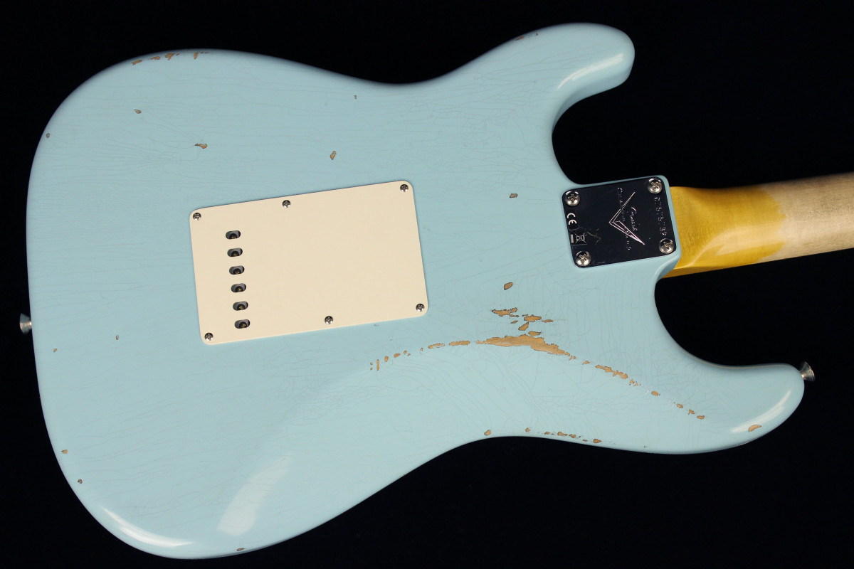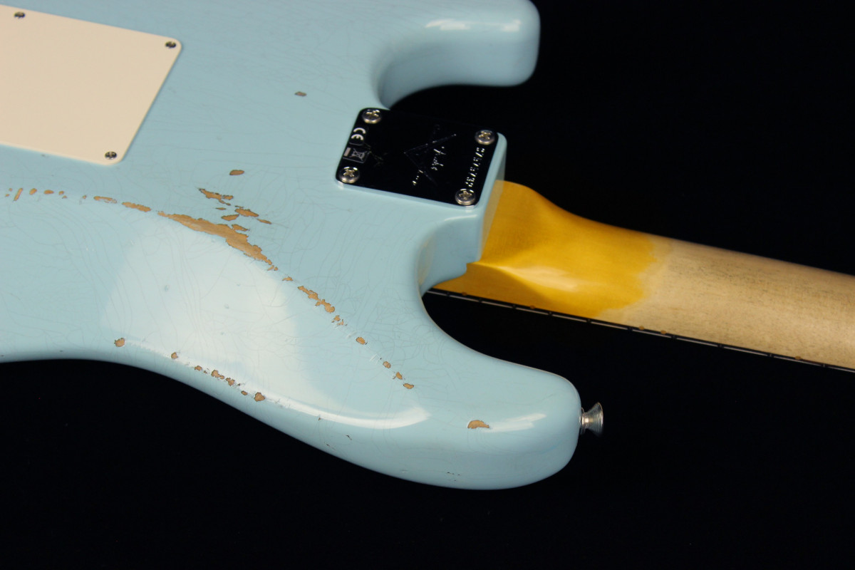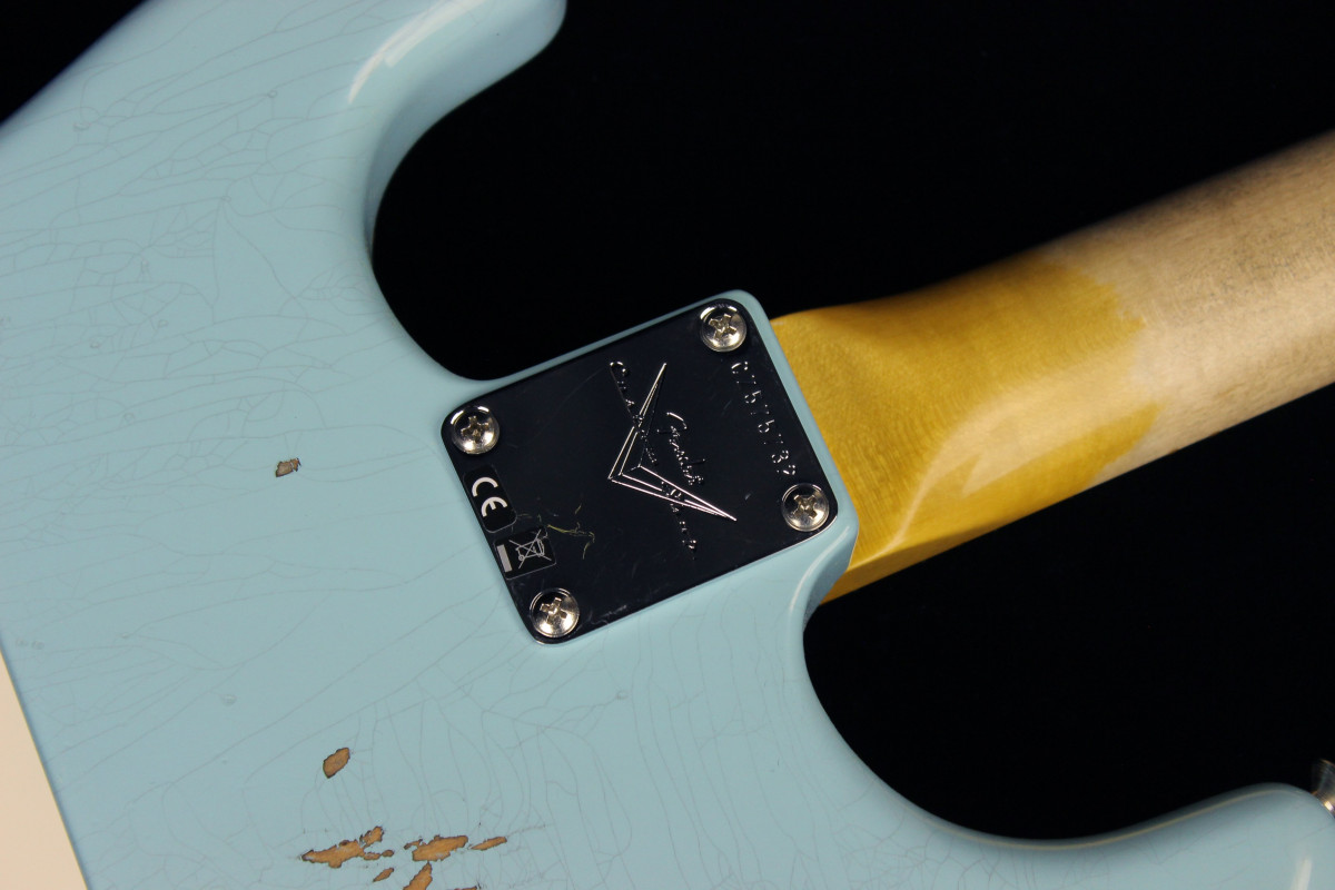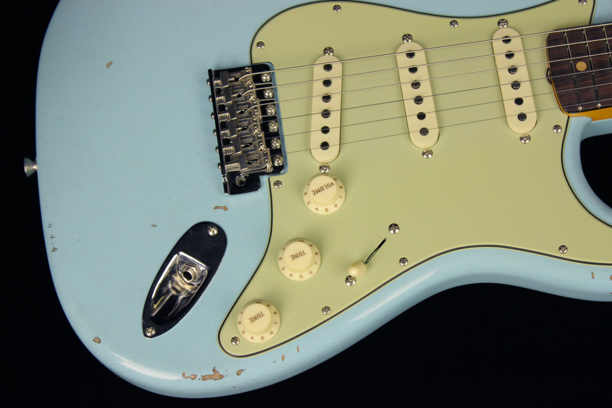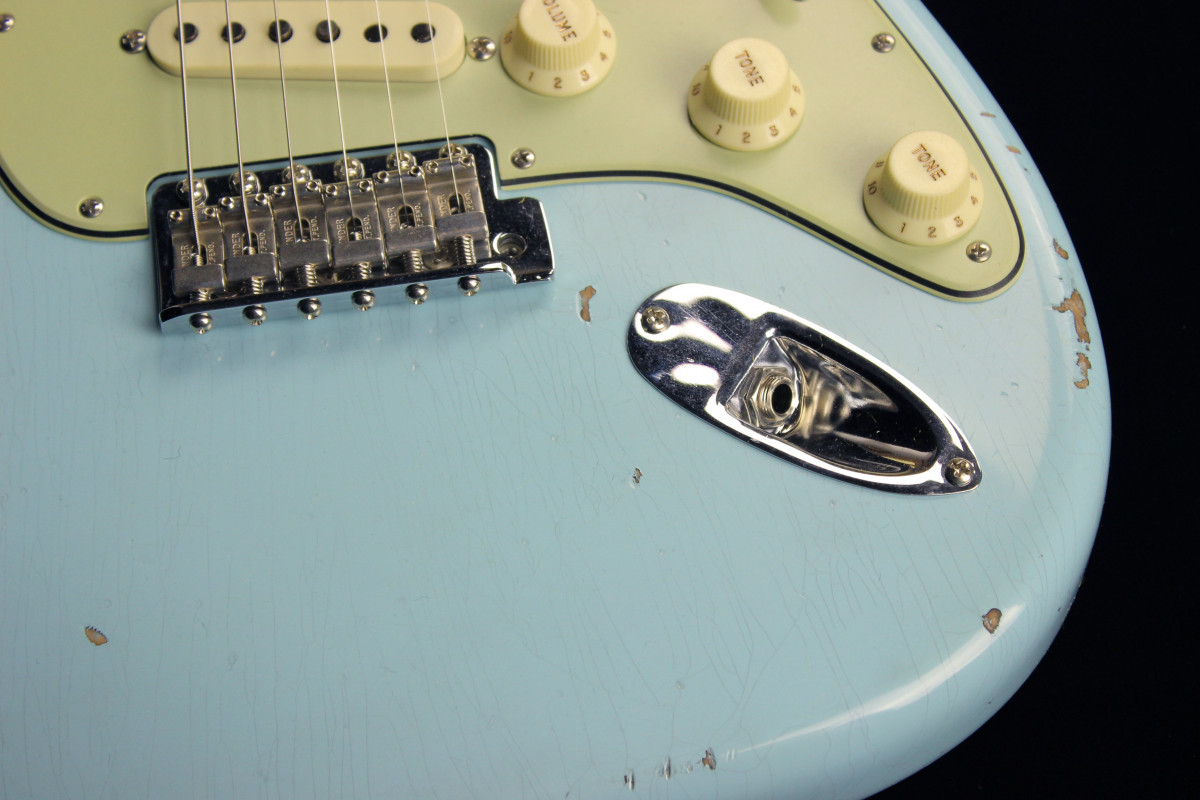 Its two-piece select alder body wears a Faded Aged Daphne Blue Relic lacquer finish. From the finish checking that covers the body to every last ding, dent and scar from bridge to headstock - plus Closet Classic hardware with showing moderate oxidization - this treatment imparts authentically worn-in look and feel and tells a story of a guitar that has experienced many years of regular use in clubs and bars.