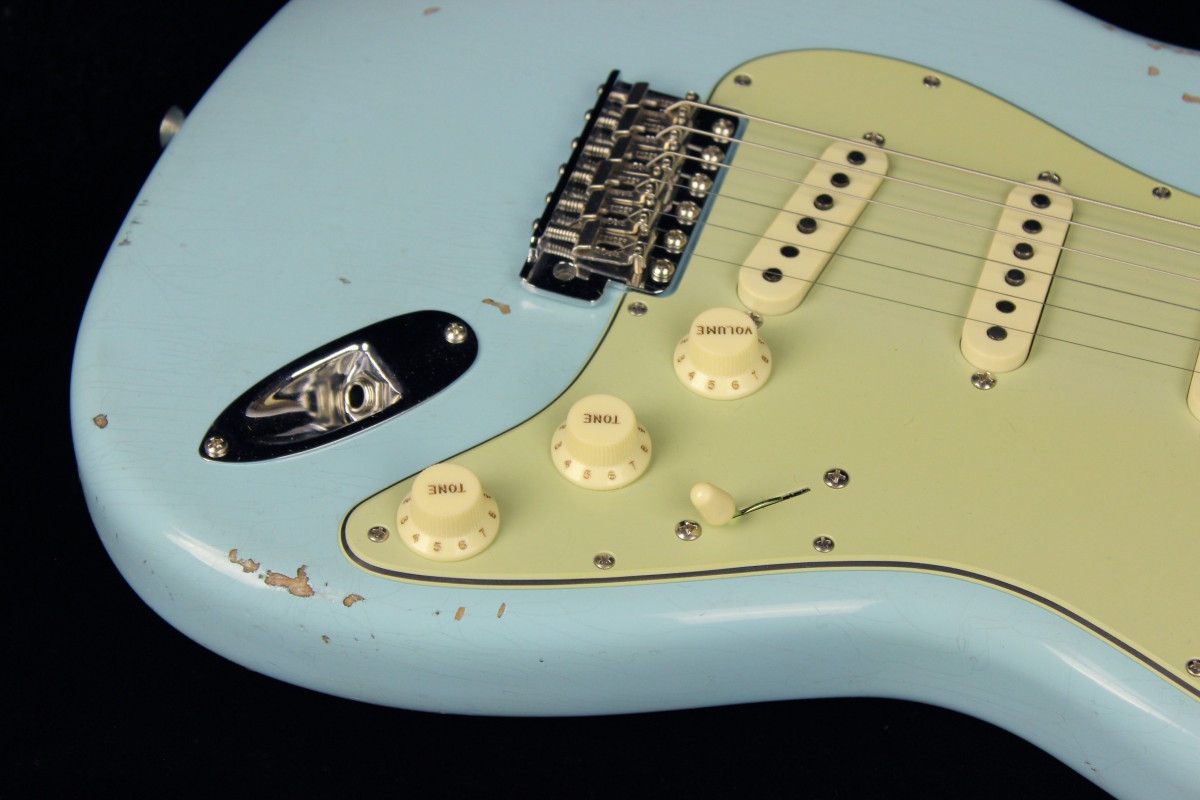 Other premium features include Vintage Modified #2 wiring with Tone-Saver bleed circuit (eliminates tone loss when volume is turned down), five-way pickup switch, three-ply mint green pickguard, Custom Shop vintage synchronized tremolo bridge, vintage-style tuners, wing string tree with tall metal spacer, deluxe hardshell case, strap and certificate of authenticity.