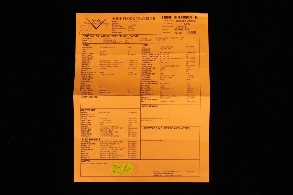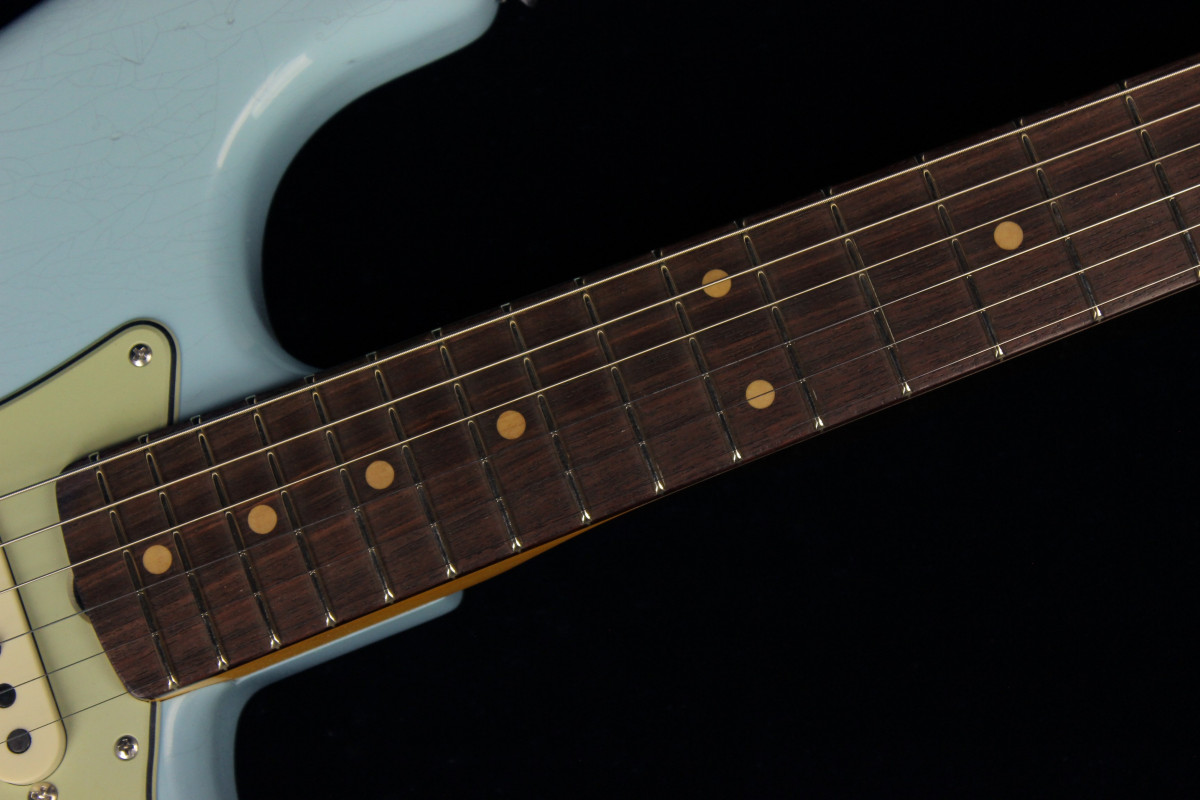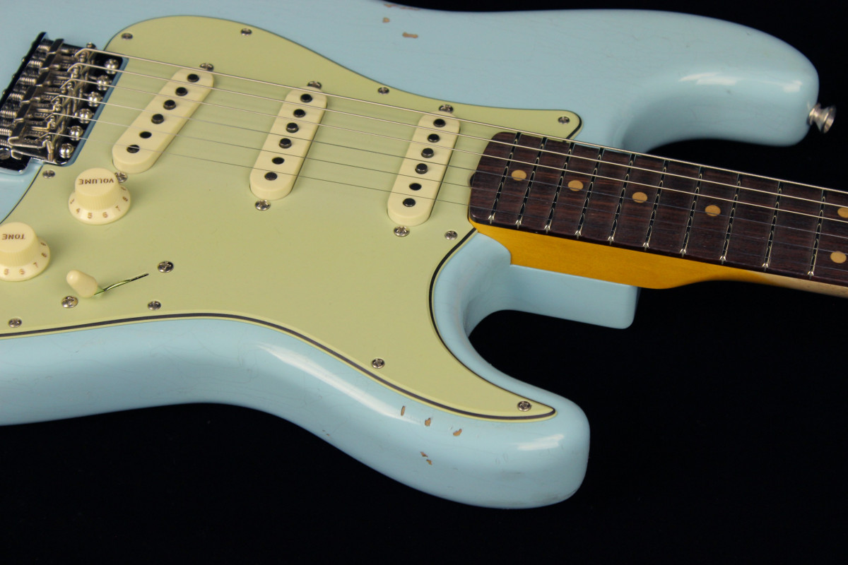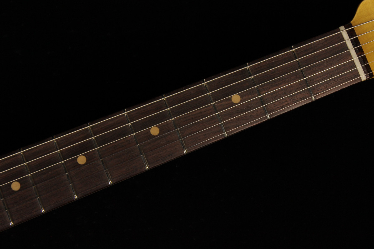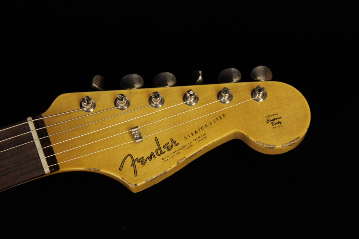 In a distinctive combination of appointments for a transitional Stratocaster from late 1962, the rift-sawn maple neck has a classic '60-style Oval "C" profile and is topped by a 9.5"-radius round-lam rosewood fingerboard with clay-dot inlays (with wide 12-fret spacing), 21 narrow tall (6105) frets and a bone nut. Three Custom Shop hand-wound '60-'63 Stratocaster Pickups (reverse-wound/reverse-polarity middle pickup for hum cancellation in switch positions 2 and 4) deliver sought-after and dynamically expressive early-'60s Strat® tone, with glassy highs, slight midrange scoop and focused lows.
