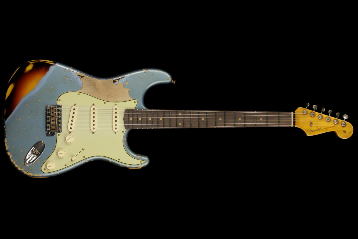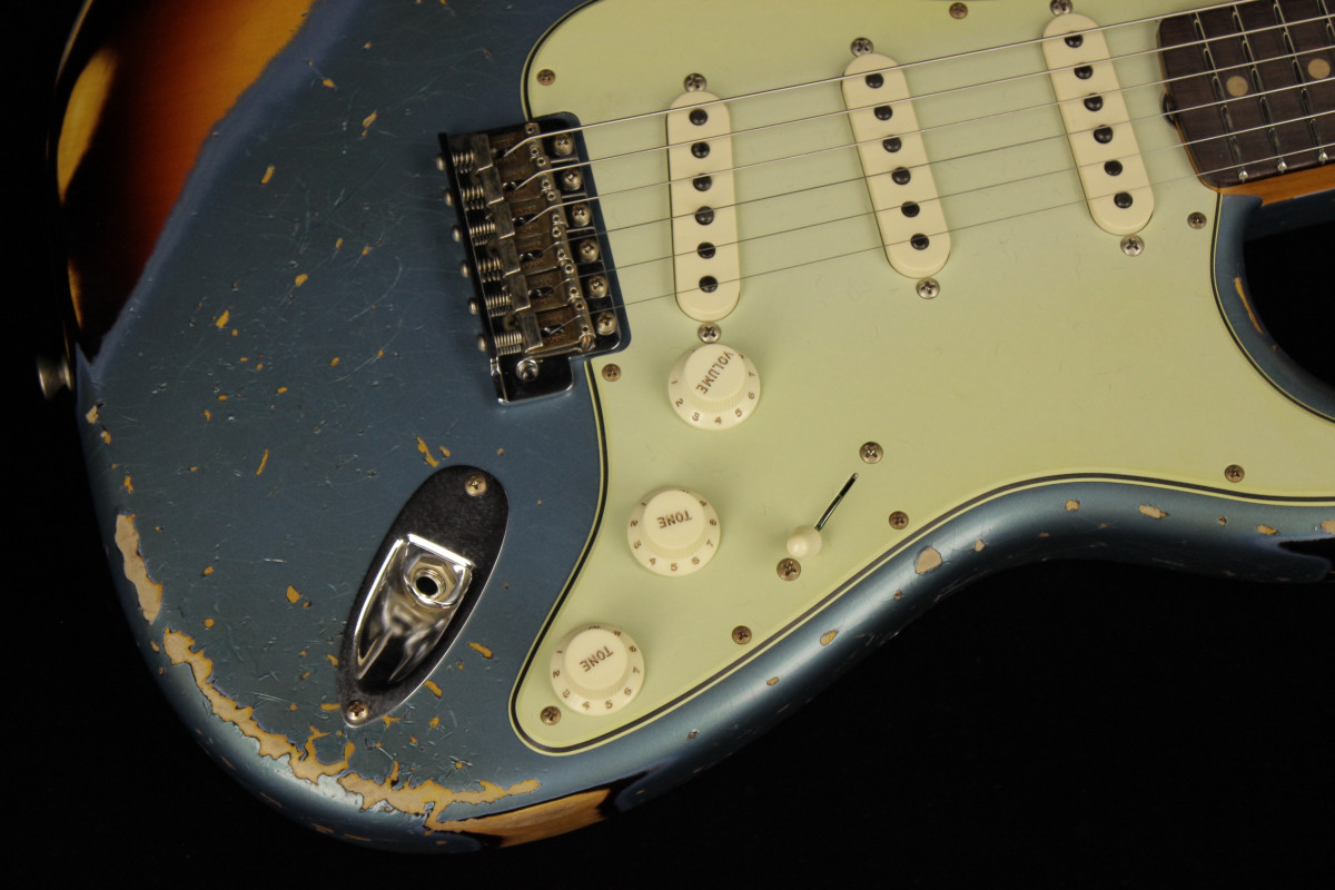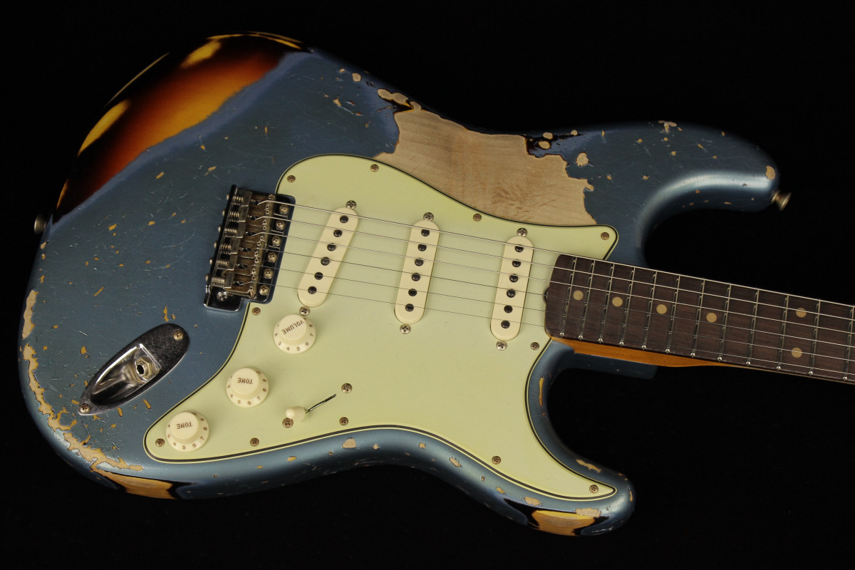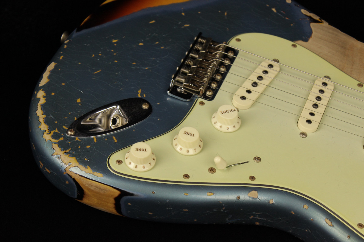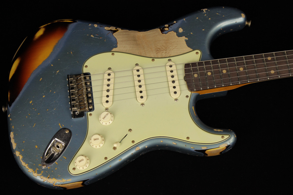 This Fender Custom Limited 1961 Stratocaster Super Heavy Relic in Aged Lake Placid Blue over 3-Color Sunburst finish features a classic Alder body sort for lightness, extremely resonant and dynamic, a Quartersawn Maple neck with a comfortable Mid 60's Oval "C" profile.