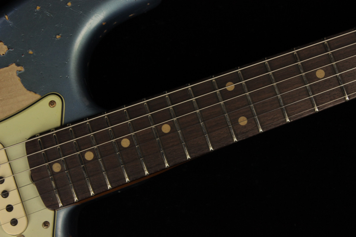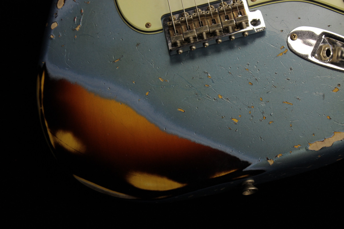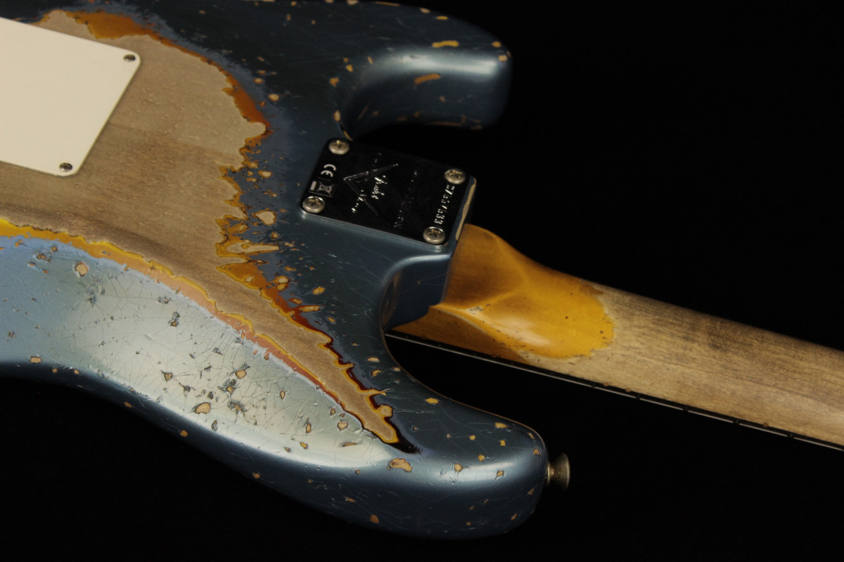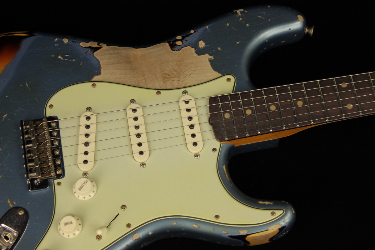 This Fender Custom Limited 1961 Stratocaster Super Heavy Relic in Aged Lake Placid Blue over 3-Color Sunburst finish features a classic Alder body sort for lightness, extremely resonant and dynamic, a Quartersawn Maple neck with a comfortable Mid 60's Oval "C" profile.