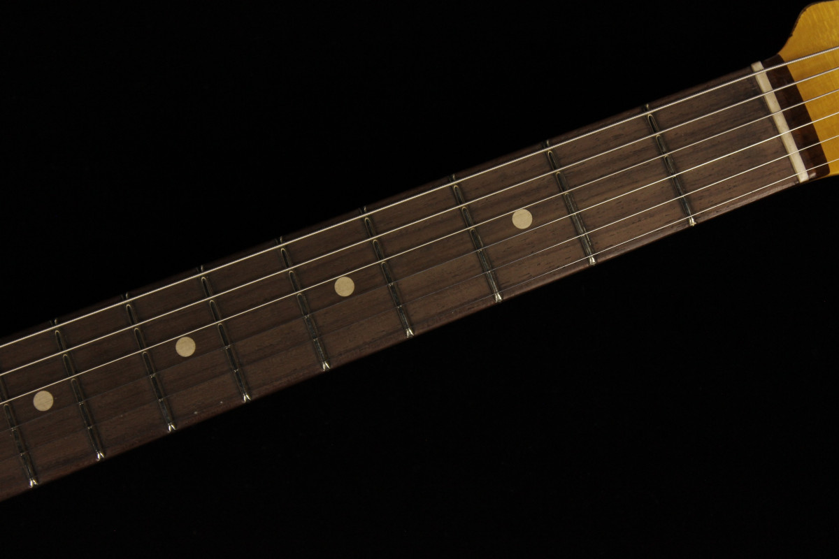 A Quartersawn maple neck has a flat-lam rosewood fingerboard, ’60-style oval “C” back-shape, 9.5" fingerboard radius and 21 6105 / Narrow Tall frets.