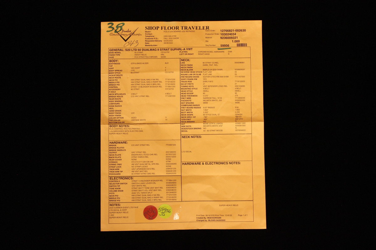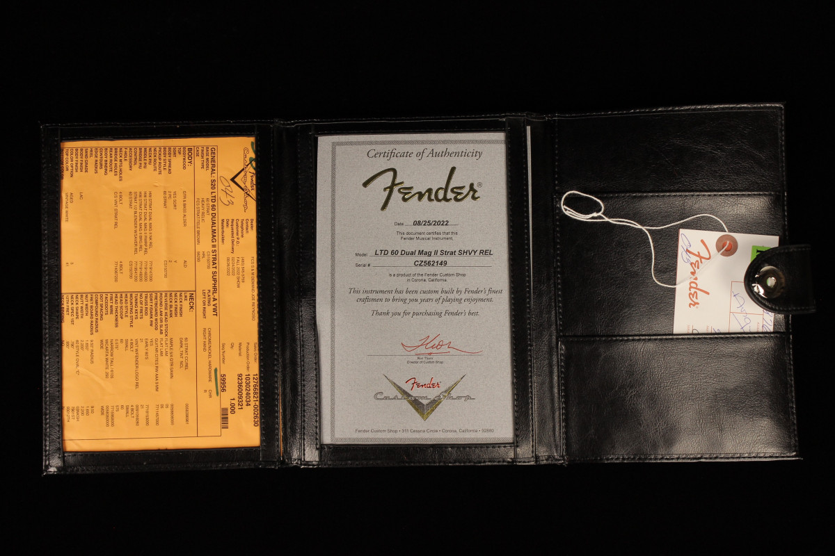 Other features include Custom Shop vintage-style synchronized tremolo, vintage-style tuning machines, bone nut and a wing string tree with metal spacer. Also includes deluxe hardshell case, strap and certificate of authenticity.