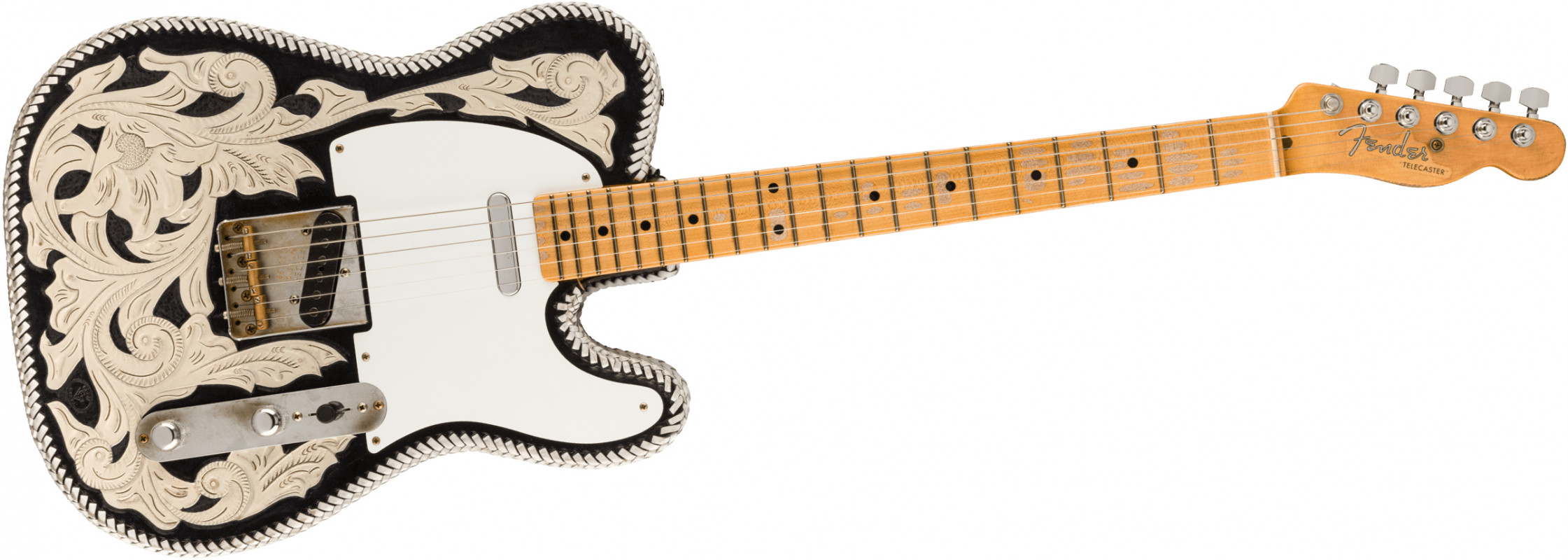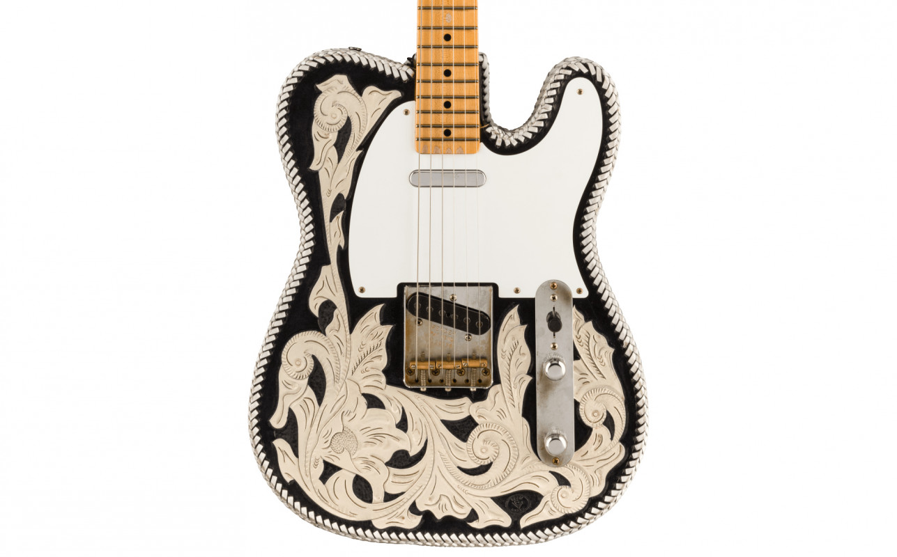 Additional features include: 7.25" Radius; 21 Vintage Upgrade (45085) Frets; Modern Telecaster Wiring with 3-Way Switch; '51-'54 Tele® Bridge with Brass Barrel Saddles; Schaller M6 Tuning Machines with Low E Banjo Tuner; Bone Nut; Single Disc String Tree; Custom Western Tooled Case; Custom Tooled Leather Strap; Certificate of Authenticity.