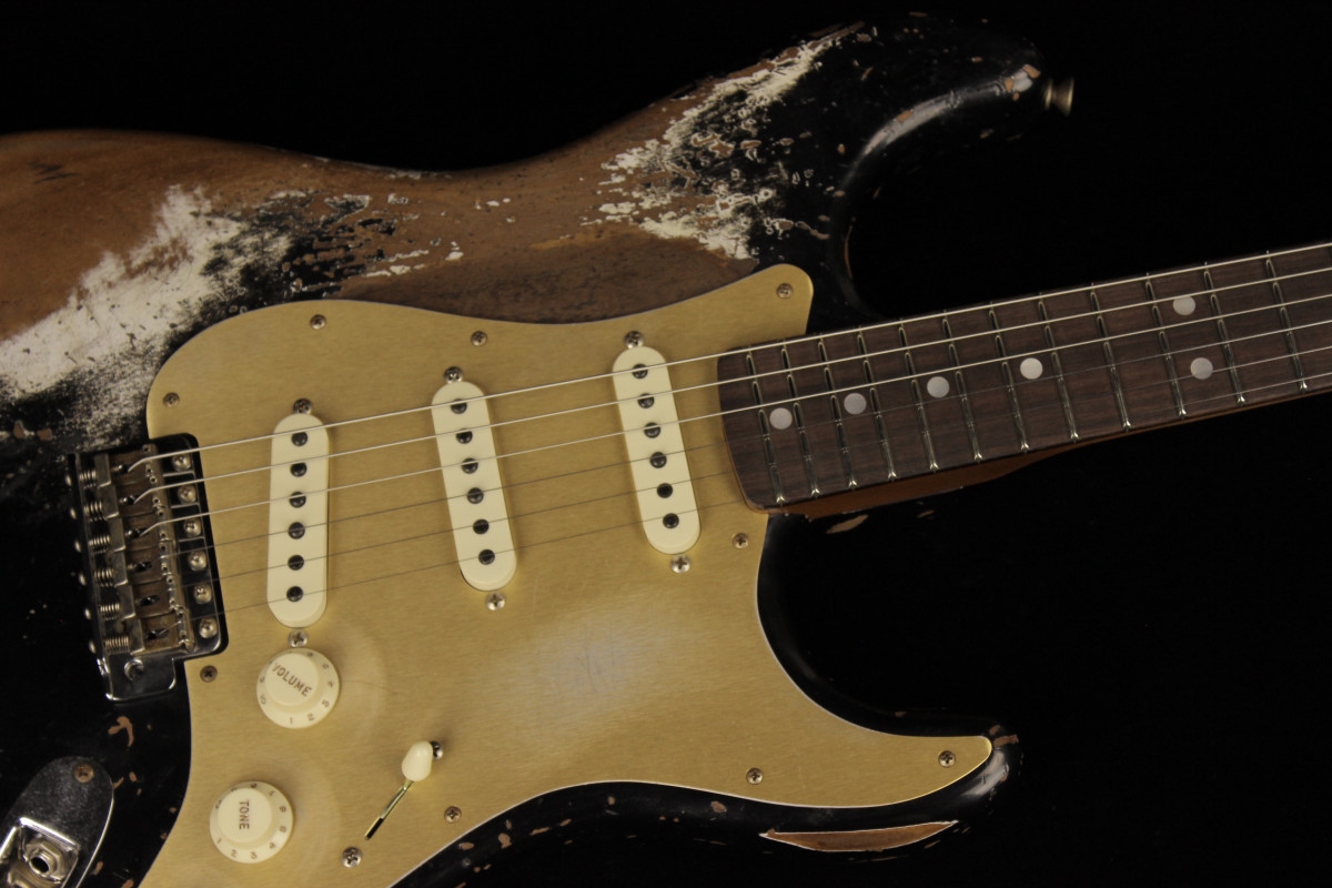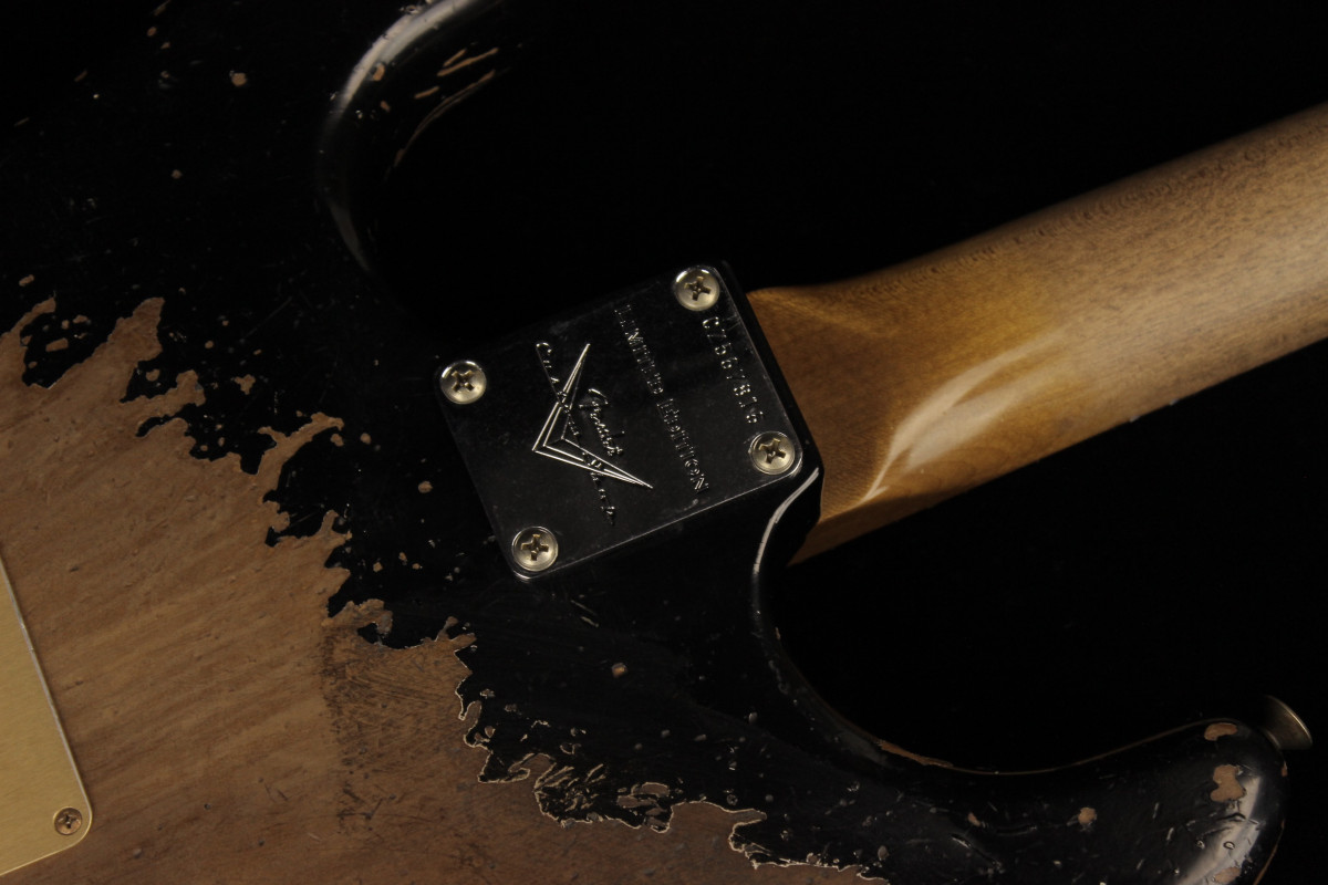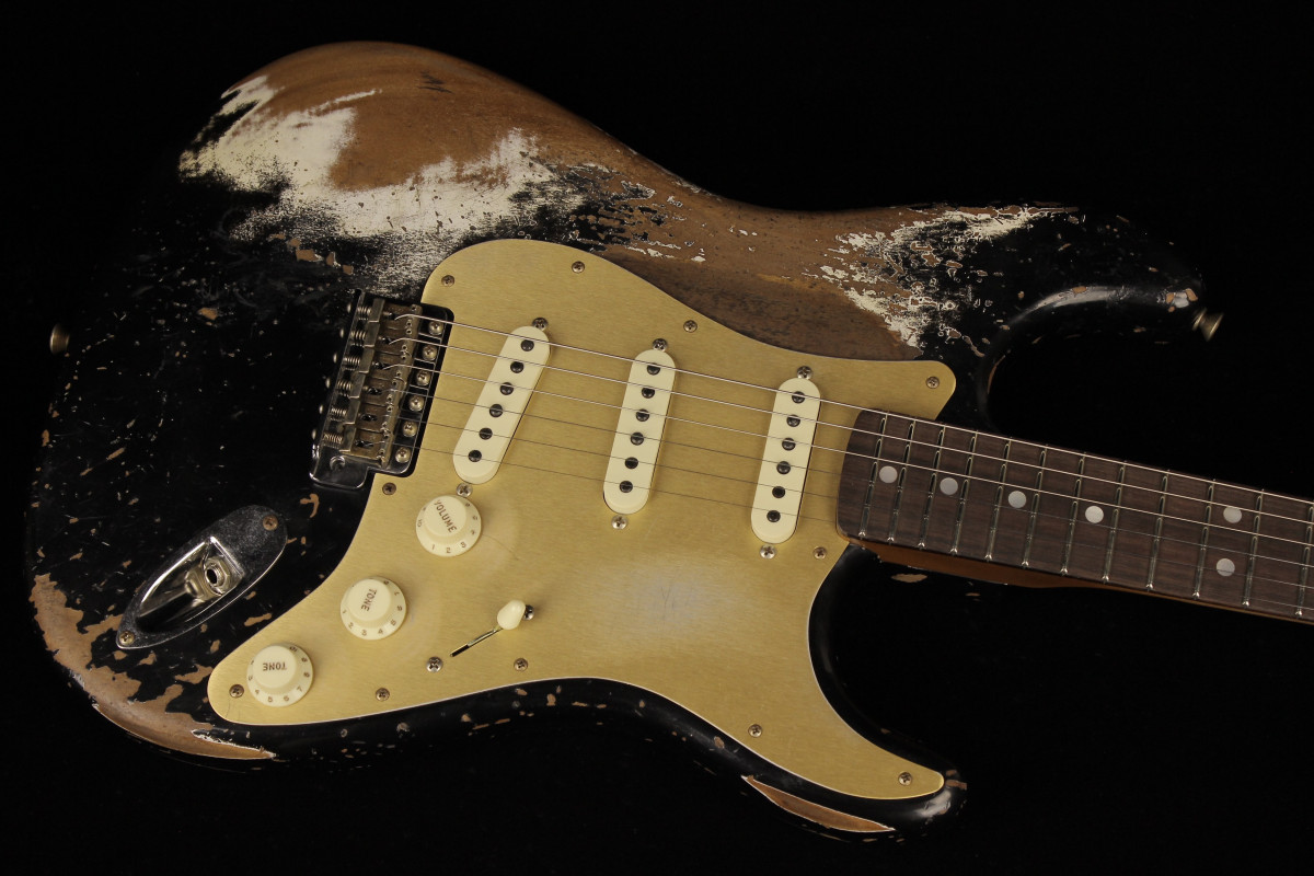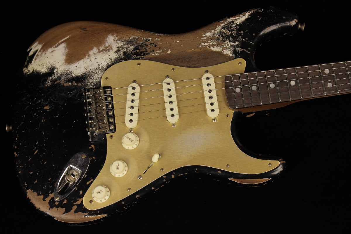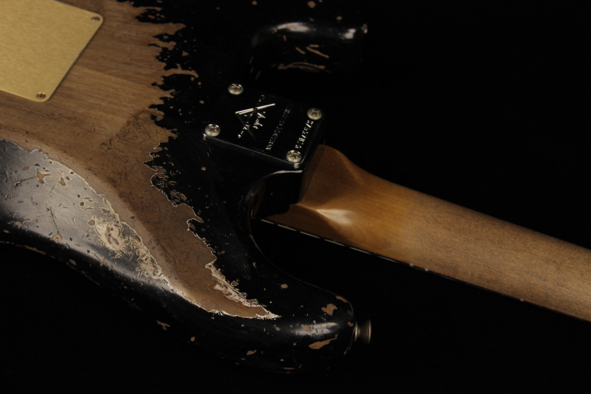 The Fender Custom Limited Roasted Big Head Stratocaster Super Heavy Relic, with a two-piece Select Roasted Alder body and roasted Maple neck for midrange punch that cuts through onstage. The name also encompasses the larger headstock, which was introduced in the mid 1960s and has been a classic Stratocaster design element ever since, and a ravishing Super Heavy Relic finish in Aged Black. With spidery finish checking all over the body and scars, dings and dents from bridge to headstock, the Super Heavy Relic treatment tells a story of an authentically worn-in guitar that has seen more than its share of action throughout many years of club and bar gigs.