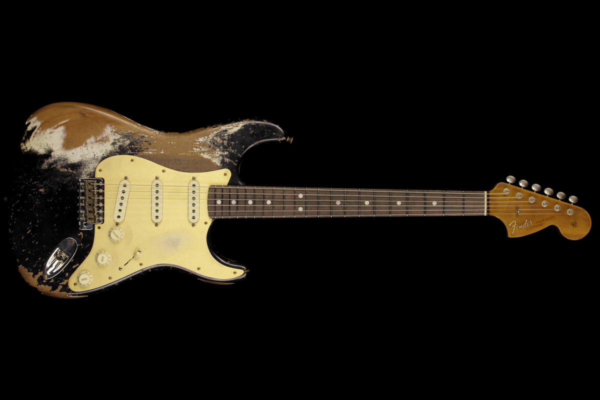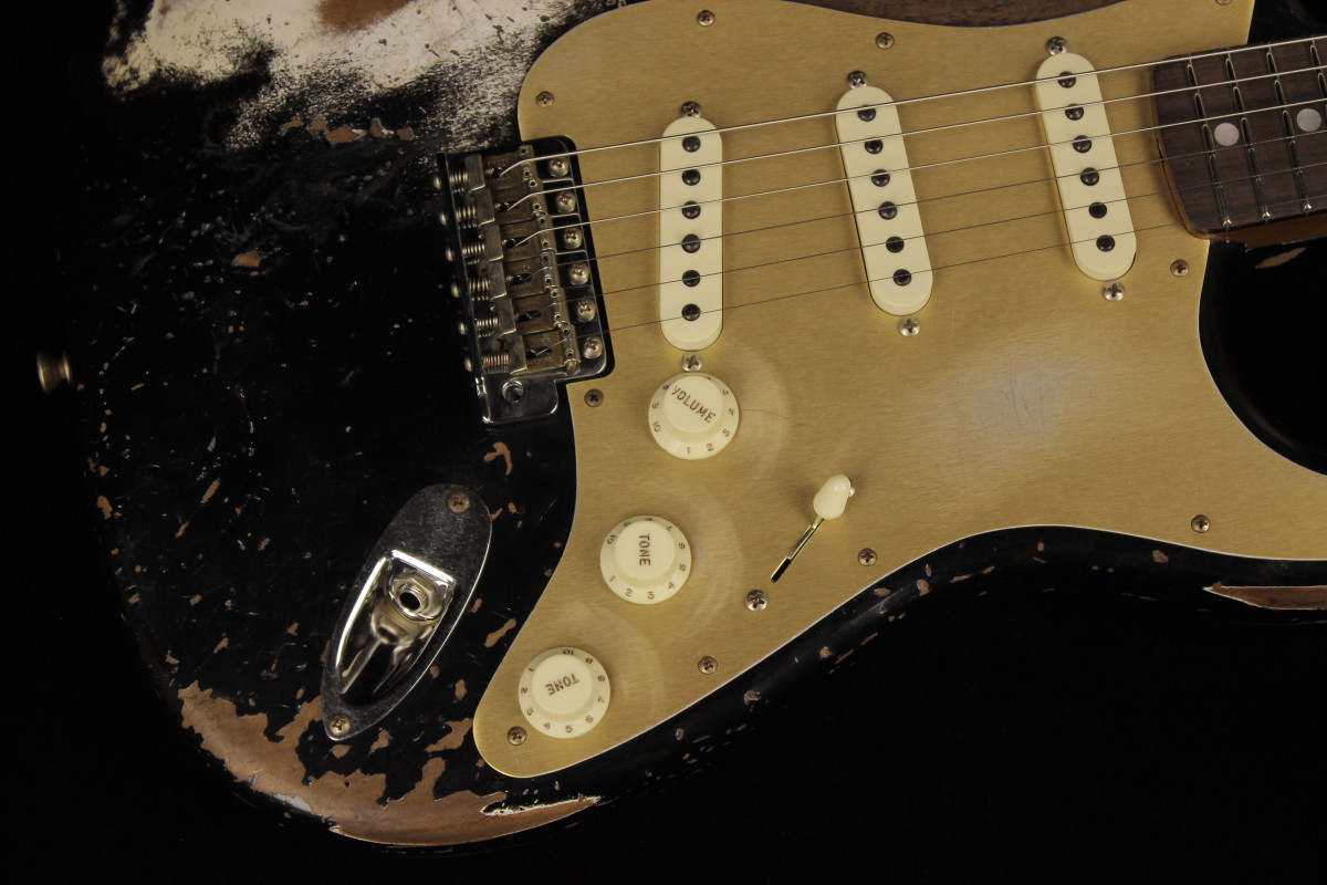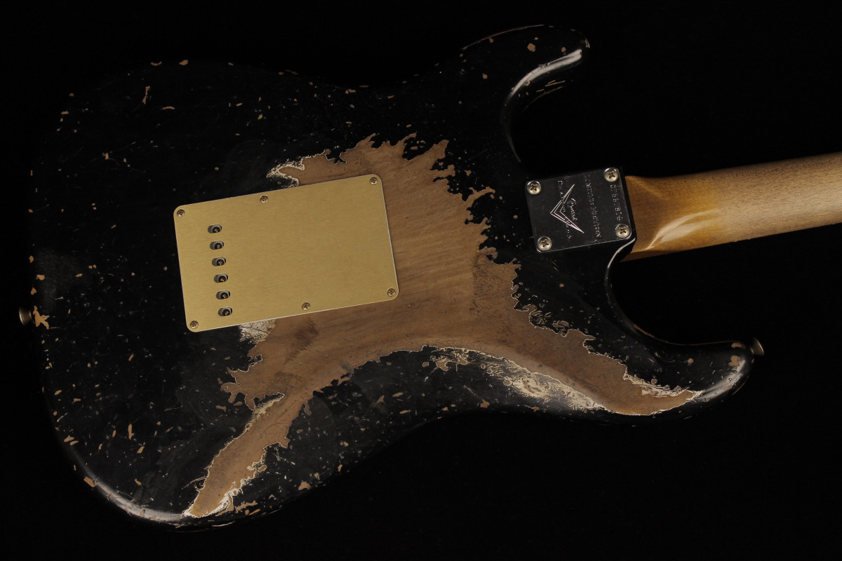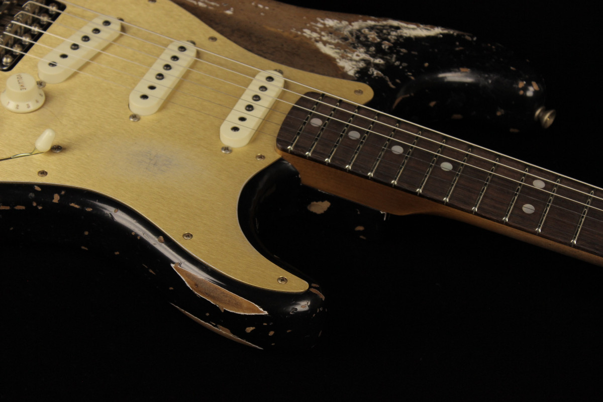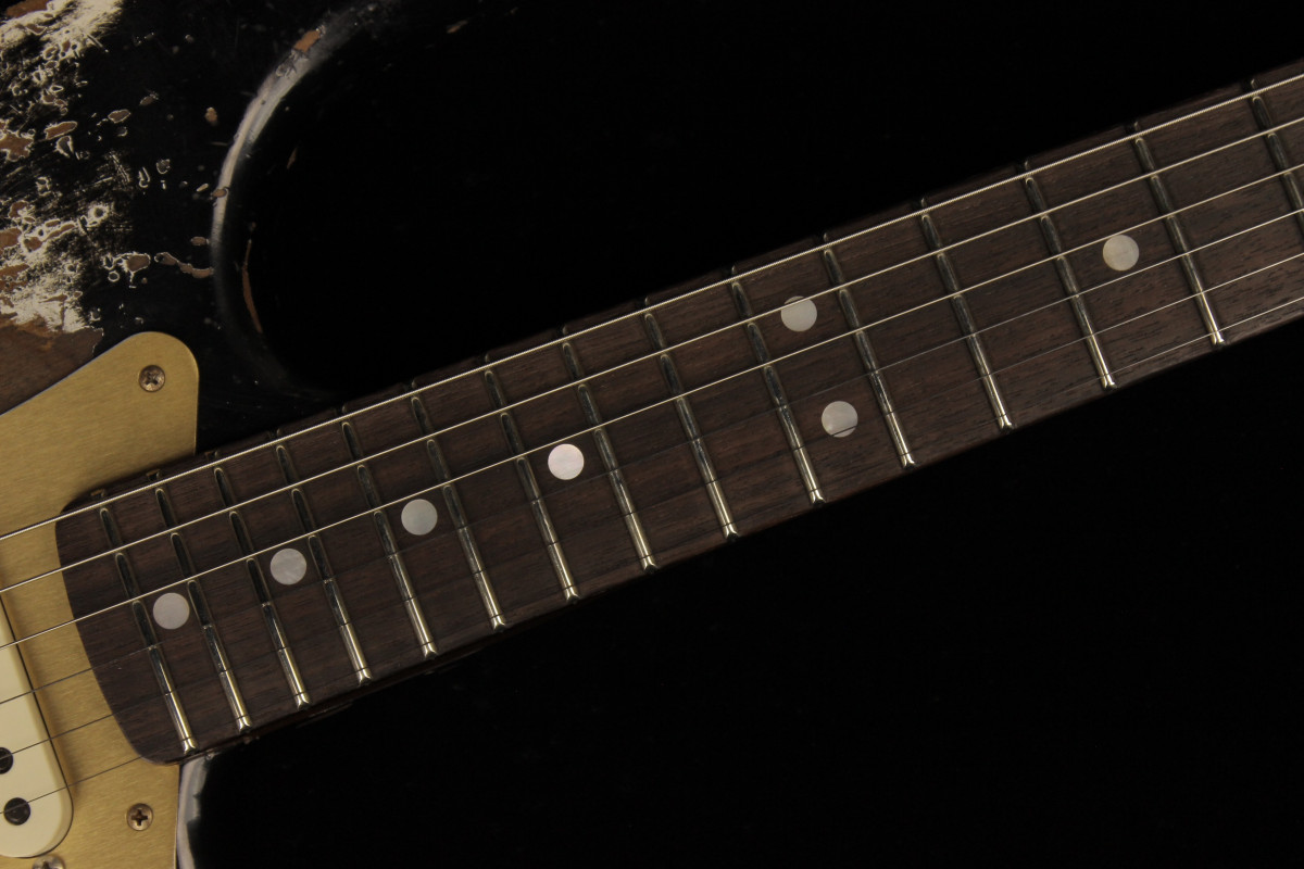 The Fender Custom Limited Roasted Big Head Stratocaster Super Heavy Relic, with a two-piece Select Roasted Alder body and roasted Maple neck for midrange punch that cuts through onstage. The name also encompasses the larger headstock, which was introduced in the mid 1960s and has been a classic Stratocaster design element ever since, and a ravishing Super Heavy Relic finish in Aged Black. With spidery finish checking all over the body and scars, dings and dents from bridge to headstock, the Super Heavy Relic treatment tells a story of an authentically worn-in guitar that has seen more than its share of action throughout many years of club and bar gigs.