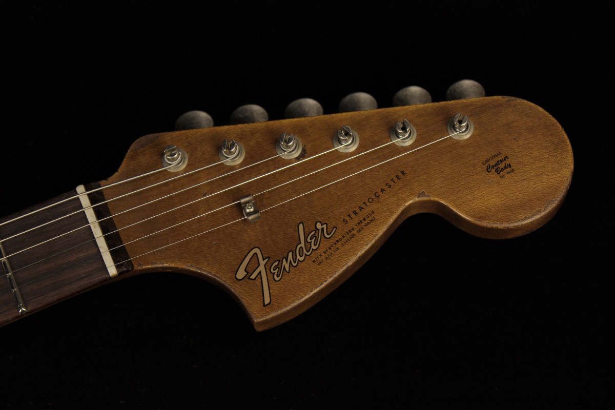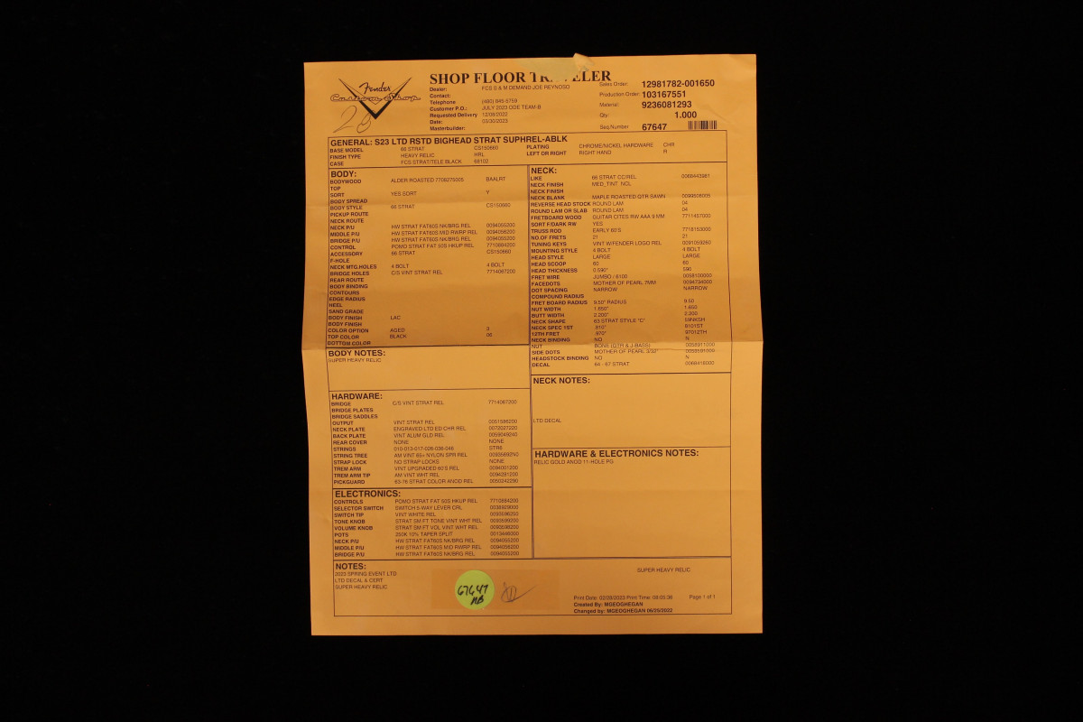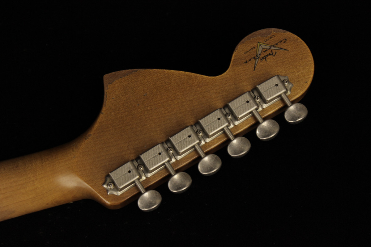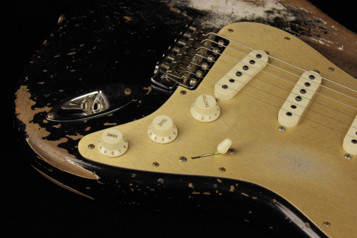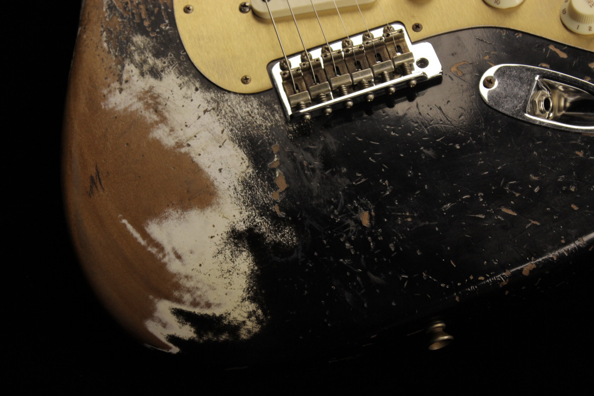 The Fender Custom Limited Roasted Big Head Stratocaster Super Heavy Relic, with a two-piece Select Roasted Alder body and roasted Maple neck for midrange punch that cuts through onstage. The name also encompasses the larger headstock, which was introduced in the mid 1960s and has been a classic Stratocaster design element ever since, and a ravishing Super Heavy Relic finish in Aged Black. With spidery finish checking all over the body and scars, dings and dents from bridge to headstock, the Super Heavy Relic treatment tells a story of an authentically worn-in guitar that has seen more than its share of action throughout many years of club and bar gigs.