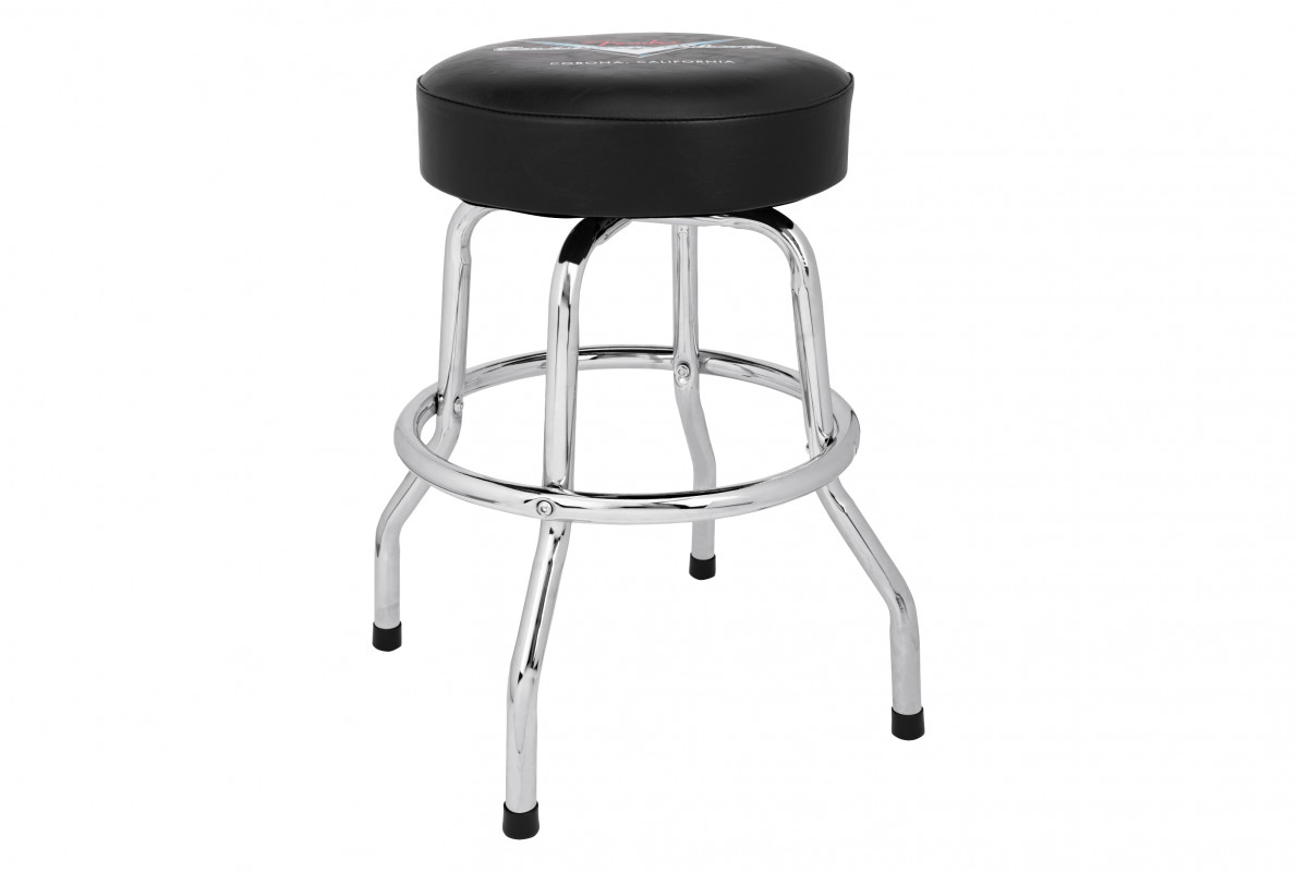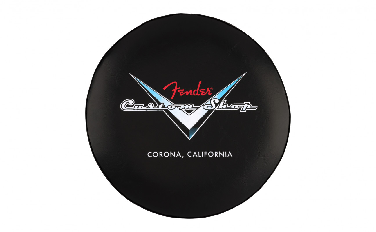 This stool is made of chrome-plated steel with a thick vinyl cushion featuring the Fender Custom Shop logo. Height: 24".