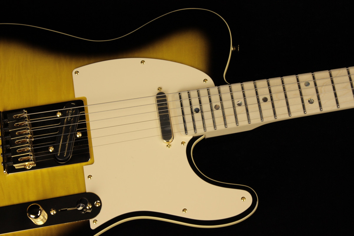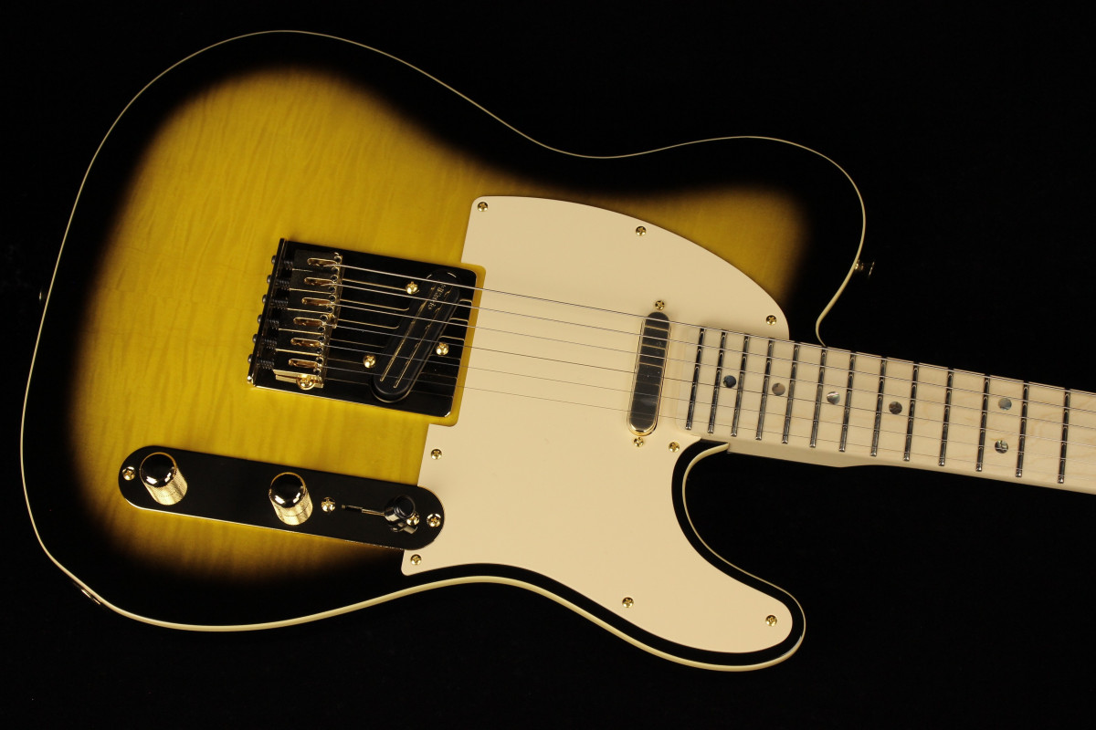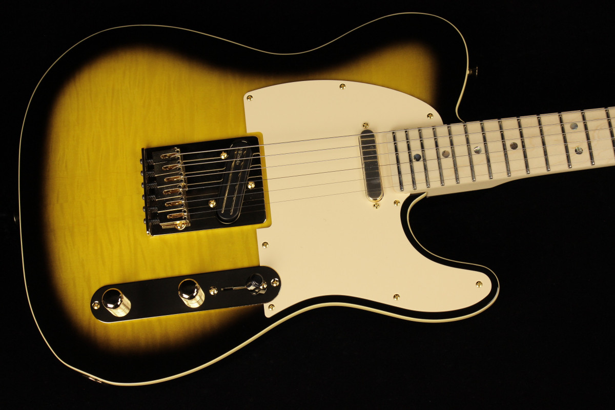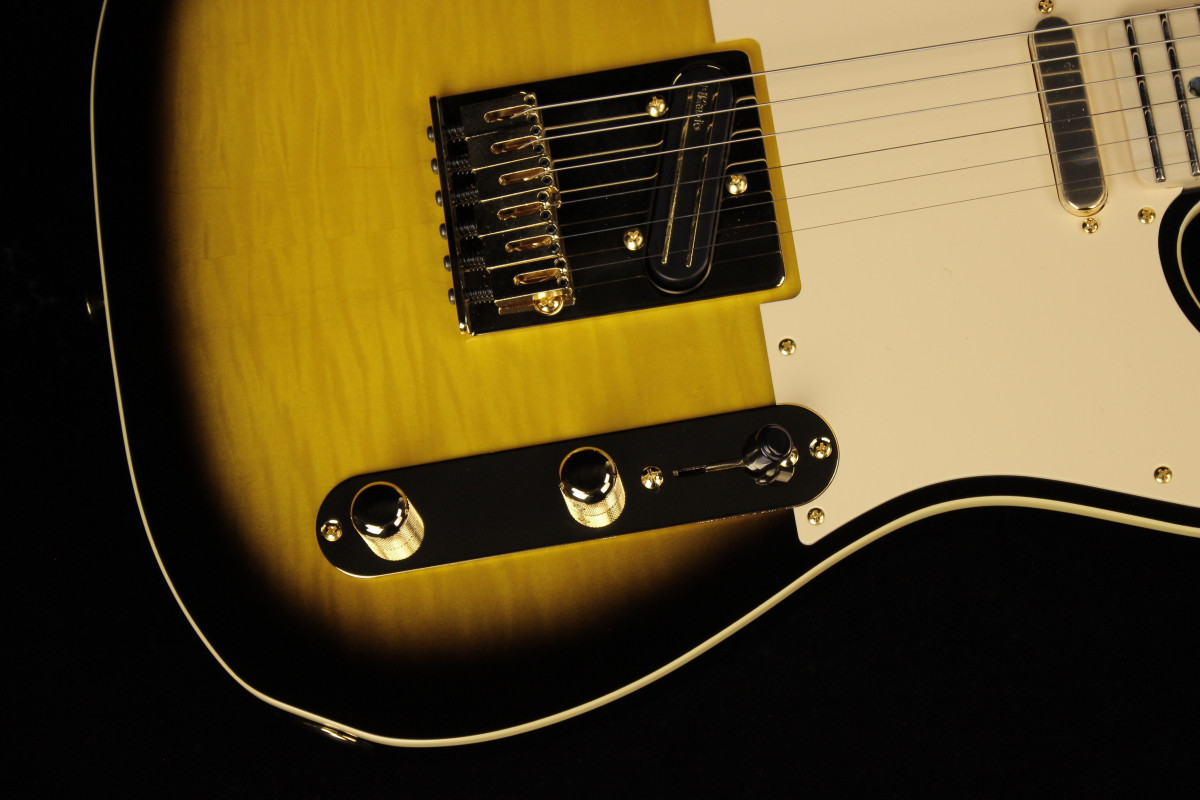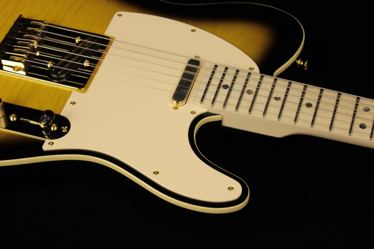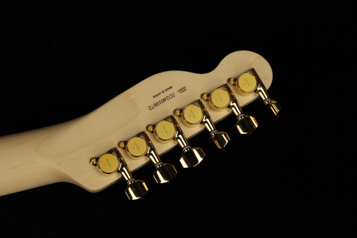 Other premium features include a satin-finish maple neck with a large “C”-shaped profile, 12”-radius maple fingerboard with 22 jumbo frets and pearloid dot inlays, three-way blade pickup switch with “barrel” tip, master volume control and rotary series/parallel switch, single-ply cream pickguard, gold six-saddle through-body Telecaster bridge, Gotoh® sealed tuners and gold hardware.