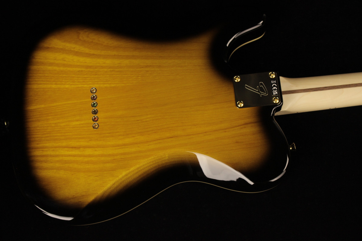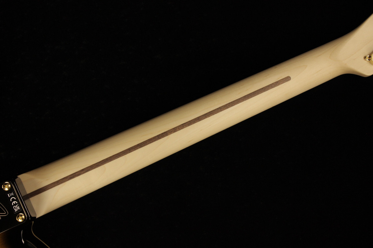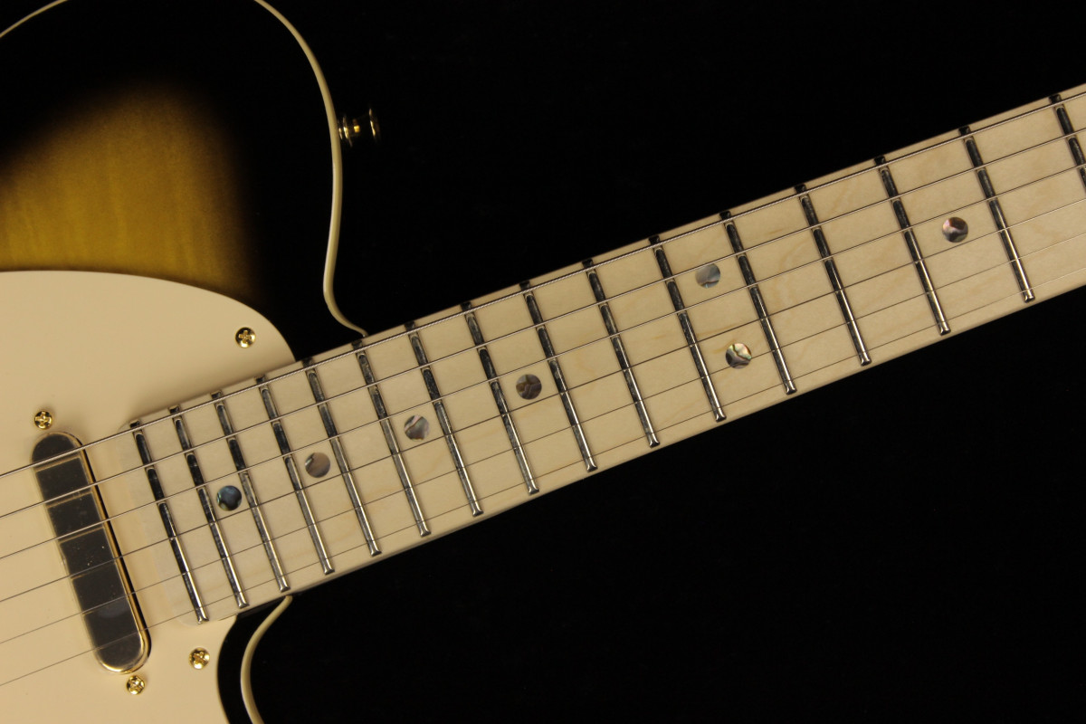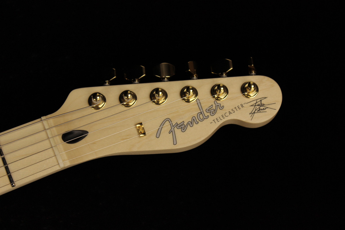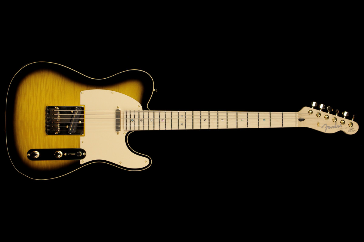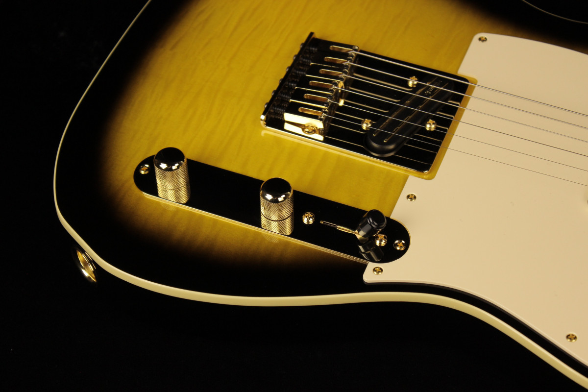 Other premium features include a satin-finish maple neck with a large “C”-shaped profile, 12”-radius maple fingerboard with 22 jumbo frets and pearloid dot inlays, three-way blade pickup switch with “barrel” tip, master volume control and rotary series/parallel switch, single-ply cream pickguard, gold six-saddle through-body Telecaster bridge, Gotoh® sealed tuners and gold hardware.