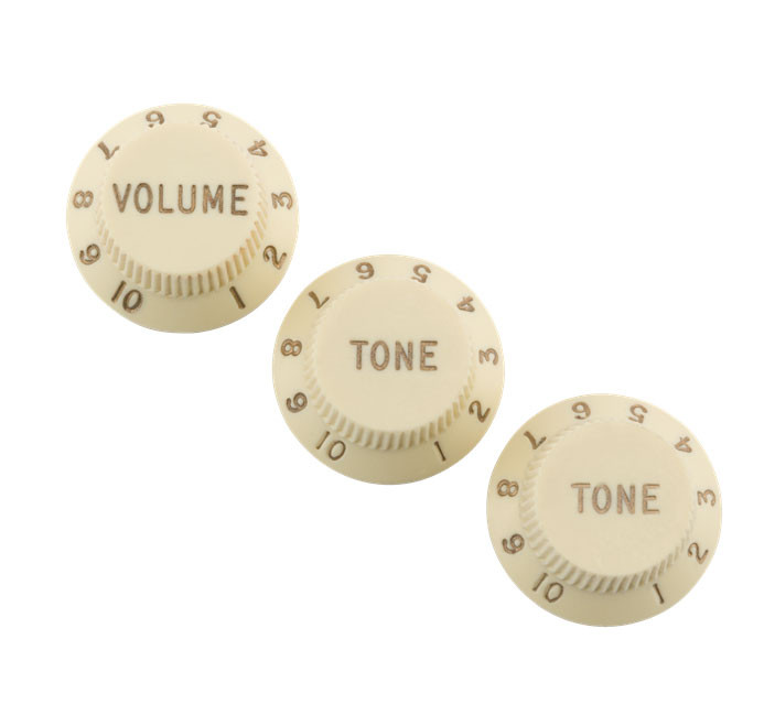 Set of 3 knobs for potentiometers (2 tone and 1 volume) for Stratocaster. This original Fender replacement, with period-correct specifications, has been designed to give your instrument an "aged" look.