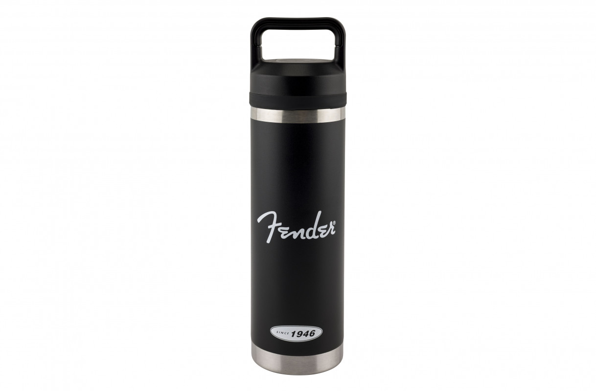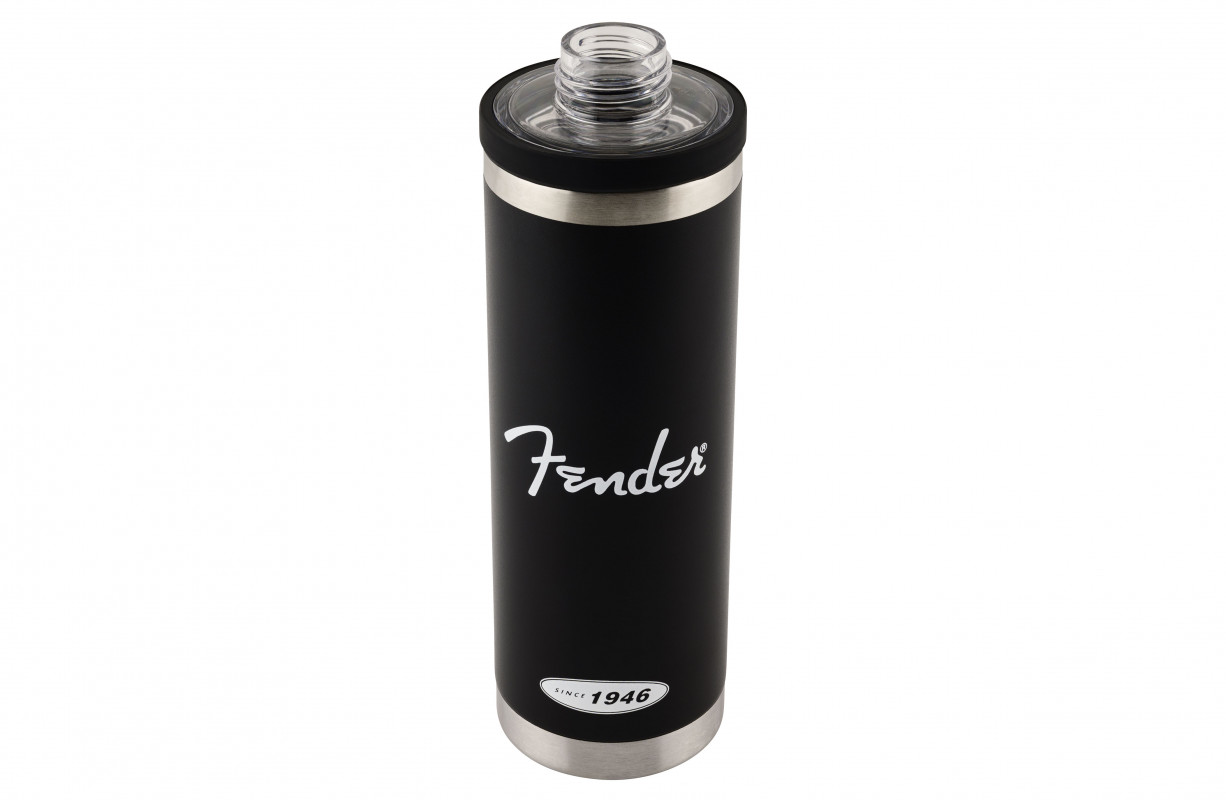 The Fender® Stainless Steel Water Bottle is an insulated stainless steel bottle designed to keep beverages hot or cold for extended periods. It features a black and steel finish with the Fender logo and the inscription "Since 1946."