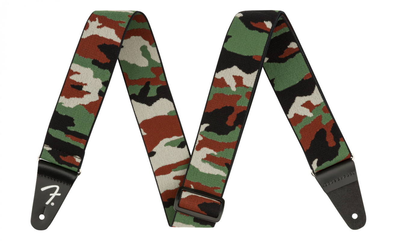 The Fender Weighless 2" Camo Strap is made from polyester to ensure durability and comfort, with leather ends featuring the Fender logo.