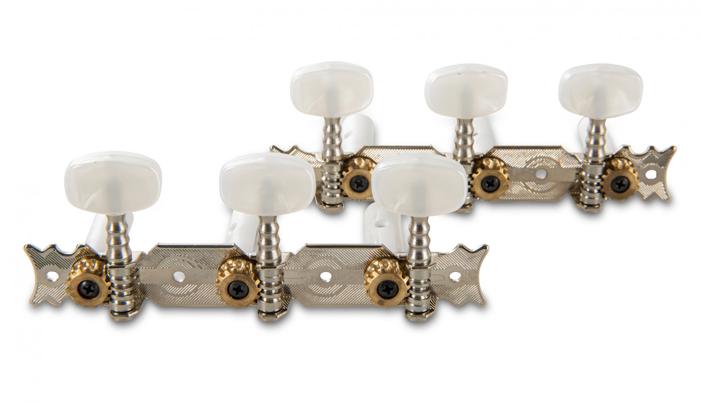 Set of tuning machines for classical guitar in a nickel finish without lyre. Pin spacing 35 mm, pin diameter 10 mm, pin length 32 mm.