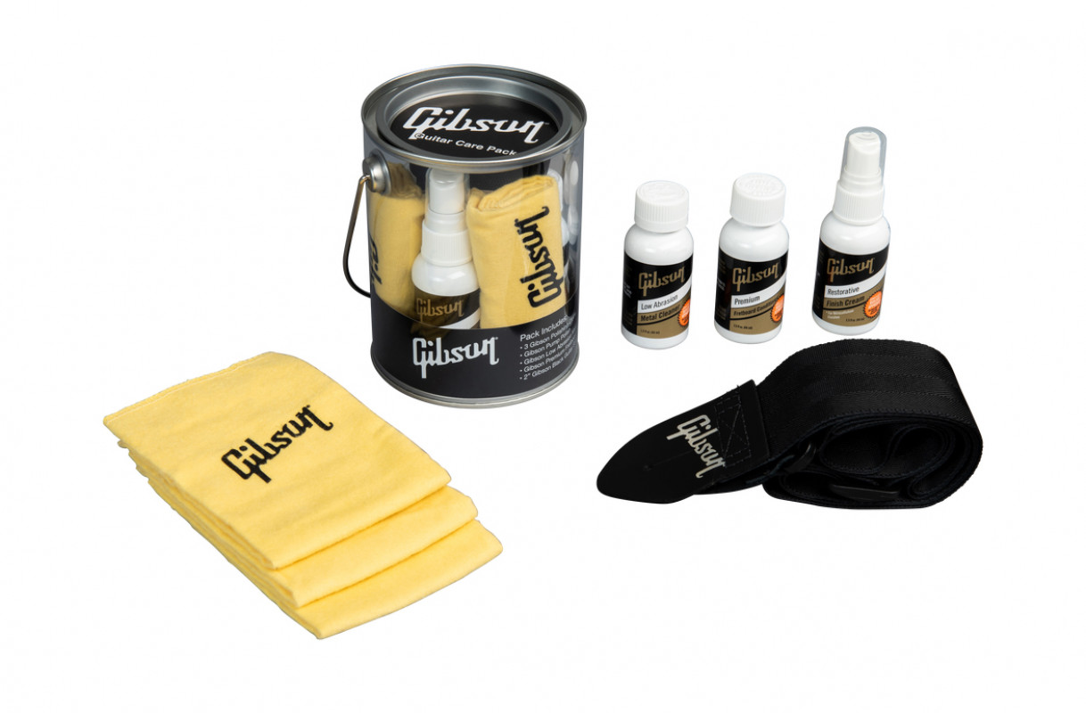 The pack includes a bottle of Fretboard Conditioner, a bottle of Metal Cleaner, a bottle of Restorative Finish Cream, 3 Gibson cleaning cloths, and a nylon Gibson strap.