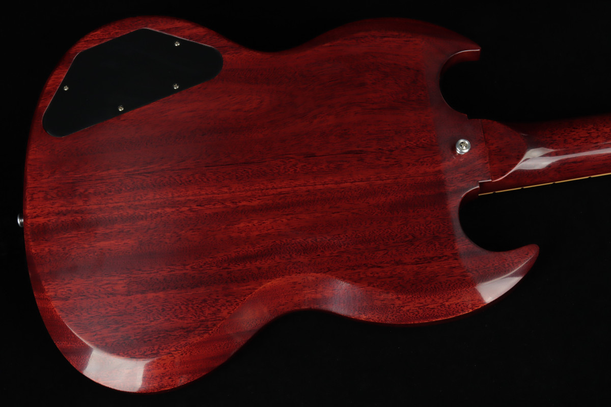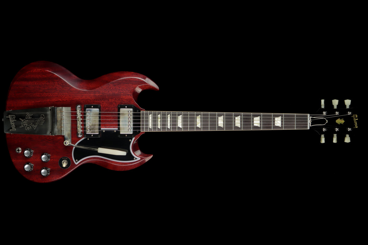 Immortalized by Santana at Woodstock and smashed onstage by Townsend, the Gibson SG is a rock icon. Gibson's Nashville-made 1964 SG Standard Reissue VOS with Maesttro Vibrola takes you back to formative years of the legendary solidbody electric guitar, in all its vintage-original-spec glory: two powerful humbuckers, Maesttro Vibrola tailpiece, cellulose Trapezoid inlays, vintage nitro finish, and all.