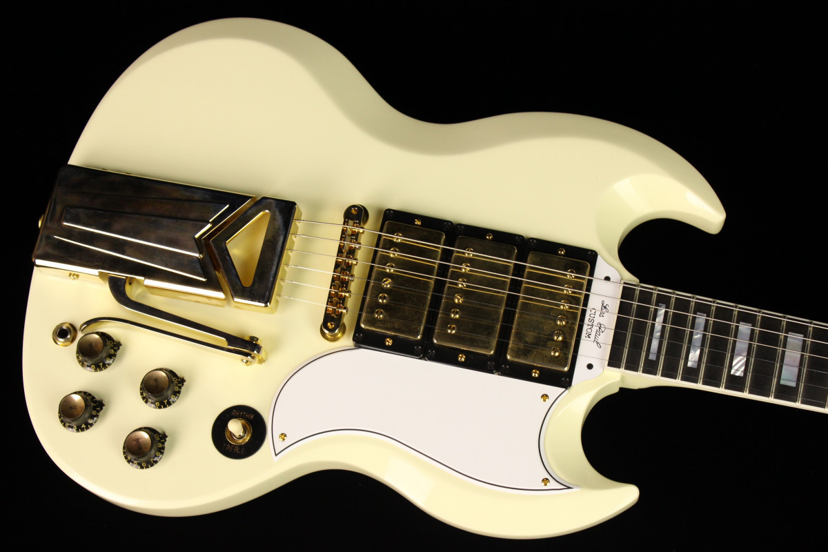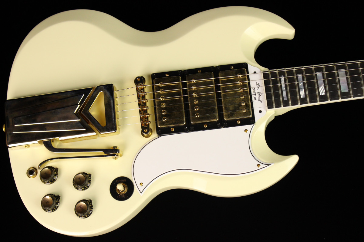 Namely, its familiar chunky, single-cutaway maple-topped body was replaced with a sleekly sculpted, all-mahogany double-cutaway body design that three years hence would become known as the SG. The Gibson Custom 60th Anniversary 1961 SG Les Paul Custom VOS celebrates this historic solidbody electric guitar with a masterful reissue, handcrafted by Gibson’s Custom Shop luthiers with fastidious attention to prototypical detail, top-shelf tonewoods, and high-performance electronics.